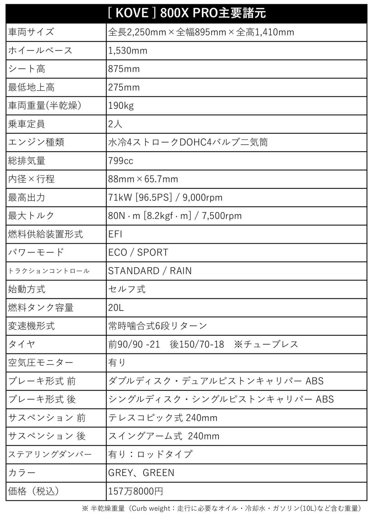トラクションコントロール、3パワーモード(ECO、SPORT、RAIN)、空気圧センサーと電子系が充実しているほか、ダブルディスクブレーキも装備。搭載している水冷4ストロークDOHC二気筒799ccエンジンは、最高速度210km/hを記録するハイパワーだ。車体は半乾燥重量190kg、シート高875mmと、ミドルクラスアドベンチャーバイクとしては軽量コンパクトで扱いやすい。フロントサスはフルアジャスタブルで240mm、リアサスはプリロードアジャスタブルで240mmのストローク、信頼のKYB製となっている。エンジンガードも標準装備で、フィールドを選ばずにツーリングを楽しむことができる。
