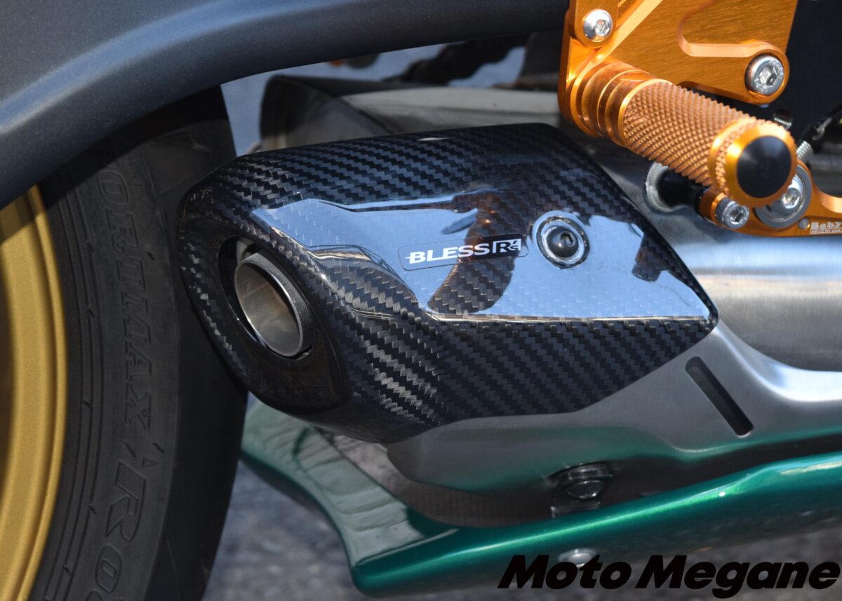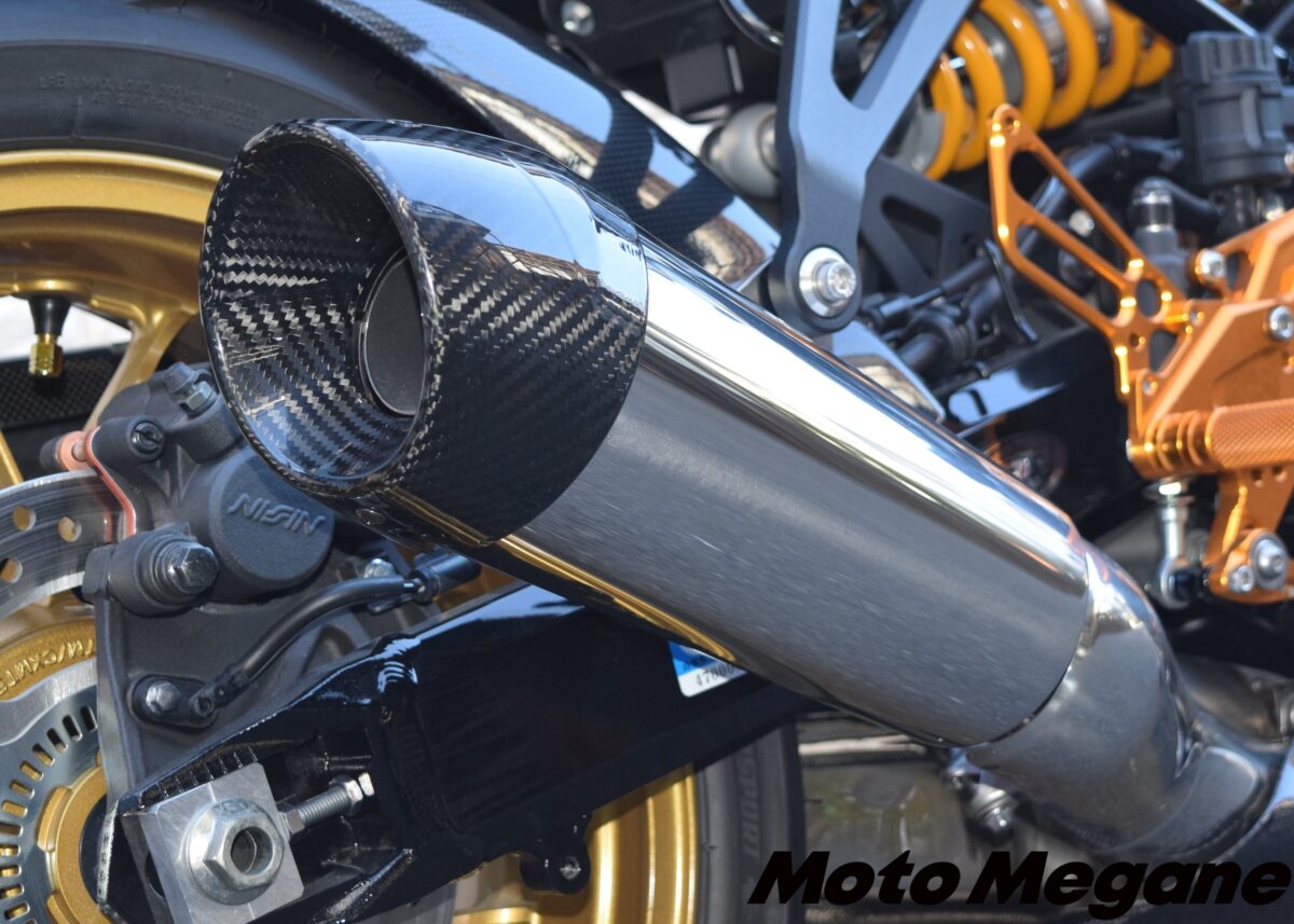 純正のサウンドやエキパイの取り回しはそのままに、ドライカーボンパーツを組み合わせることでレーシーなスタイルを構築する。