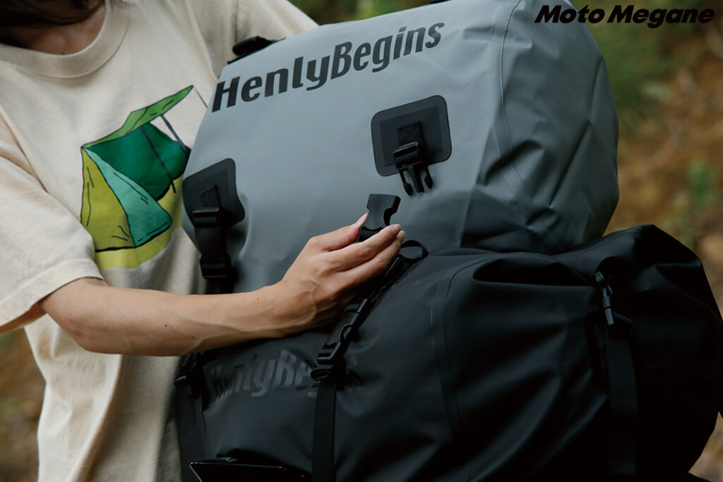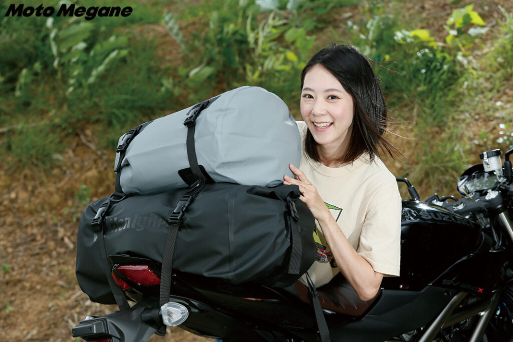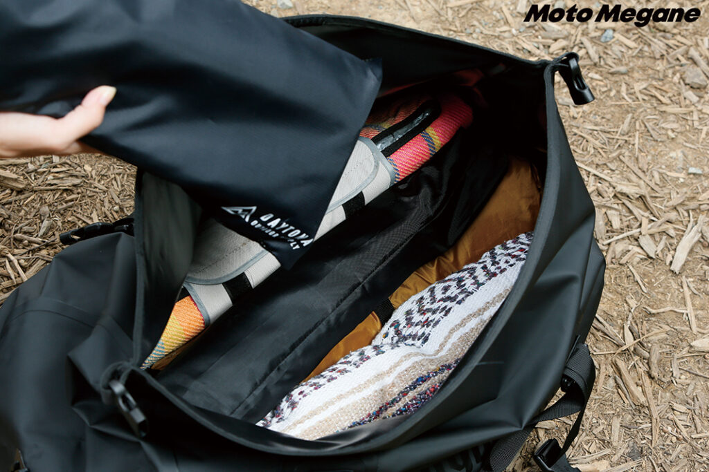 バッグにごそっと荷物を積み込める防水バッグは、大きな荷物が増えるキャンプツーリングにぴったり。キャンプギアに合わせてパズルのように細かく積み方を考える必要もないので、荷物をまとめる袋のようなワイルドな使い方ができる。ただし、道中に1つだけアイテムを出したい時などには向いておらず、小さいアイテムも箱やポーチにまとめておかないとかなり探しづらくなってしまう。そんな時はキャンプギアと身の周り品を入れておくバッグに分けるなどの工夫も大切。