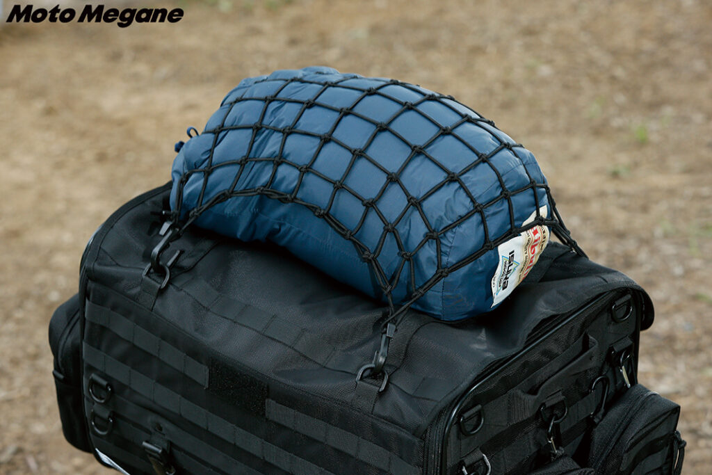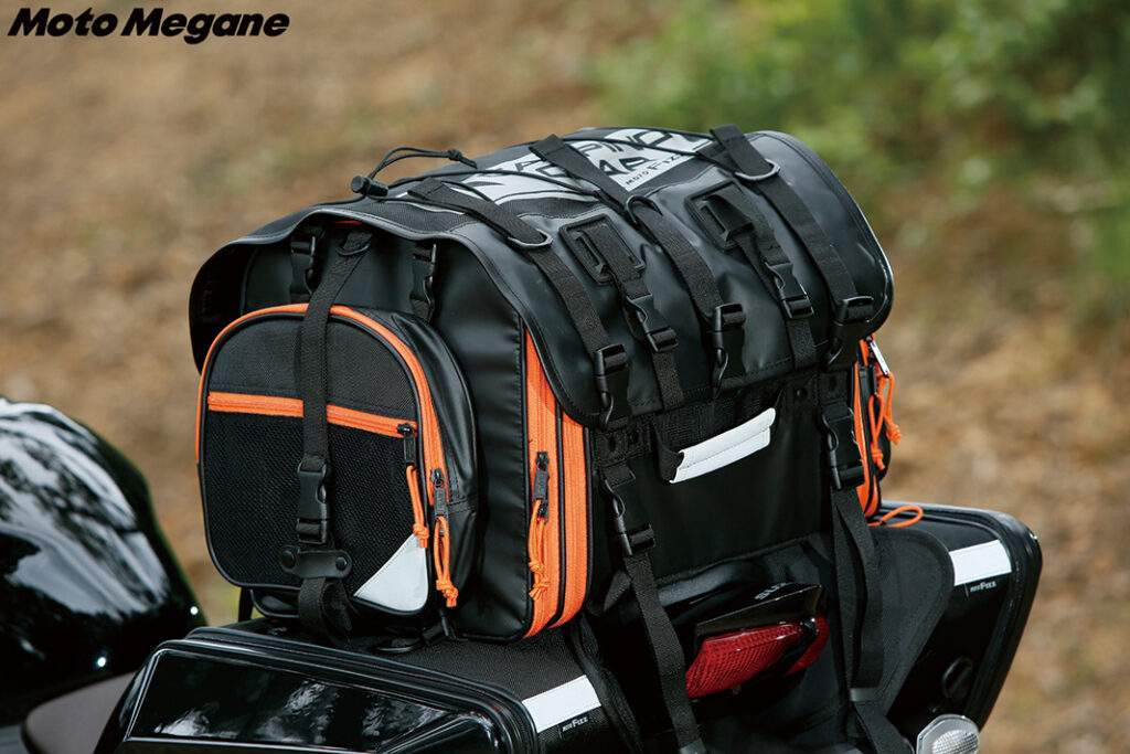 初心者からベテランキャンパーまで、キャンプツーリングの荷物を車載する方法として最もポピュラーなのがシートバッグを使った車載方法。キャリアのない車両でもリアシートへ簡単に固定することができ、バイクや用途に合わせて様々なサイズが展開されているのも選ばれる理由の一つだ。また、バッグ自体の剛性が高いので重たいキャンプ用品を入れてもしっかりと固定することができる反面、伸縮性がほとんどないので自分のキャンプギアの収納サイズをしっかりと把握しておく必要がある。