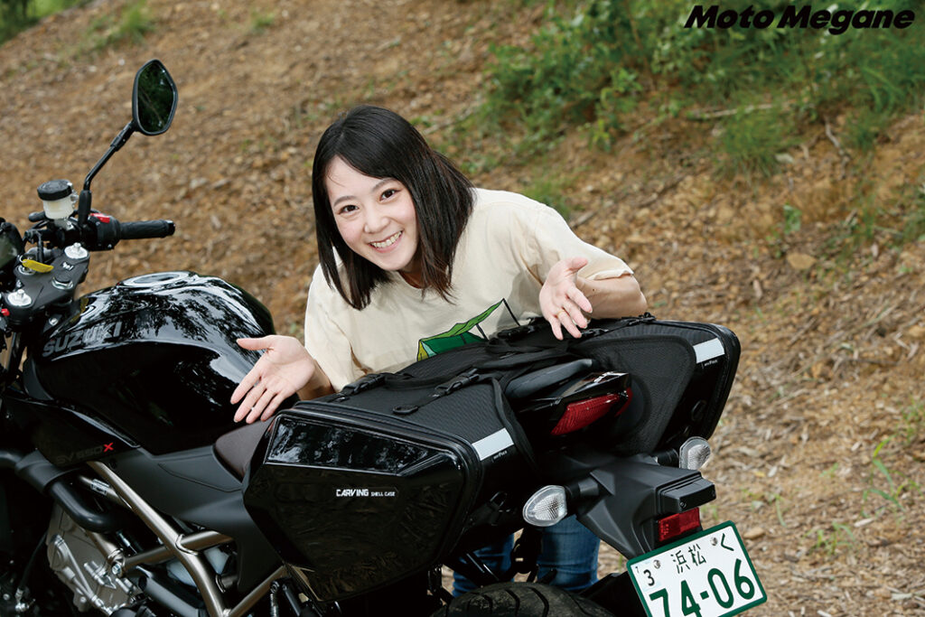スポーツバイクやリアシートの小さいバイクにオススメしたいのが、サイドバッグを使った車載方法。リアシートを跨いでつけるタイプのバッグはシートバッグのように荷物をごそっと収納するのは難しいが、左右に振り分けて収納できるので重さも分散させることができ、重心の位置も下げることができるのがポイントだ。また、長物の荷物やシートバッグをサイドバッグの上に載せることもできる。