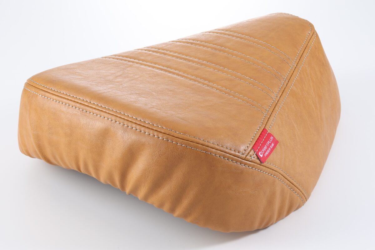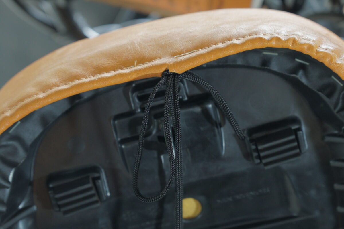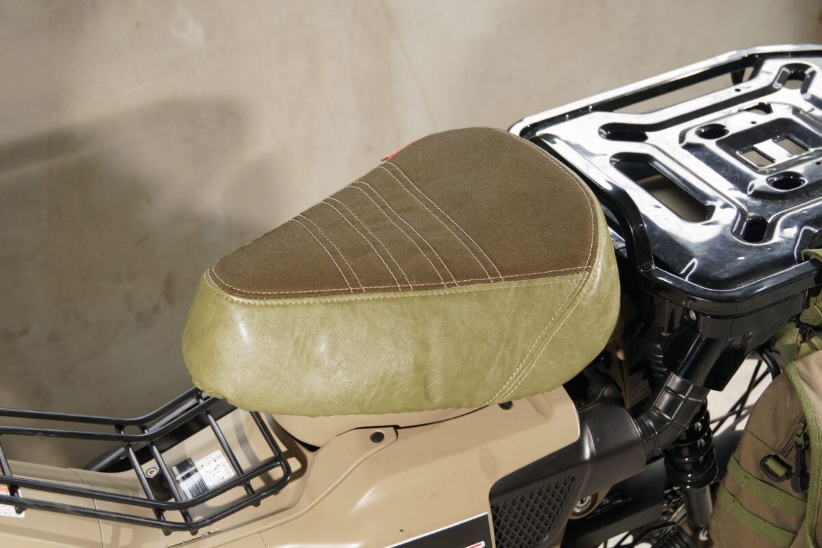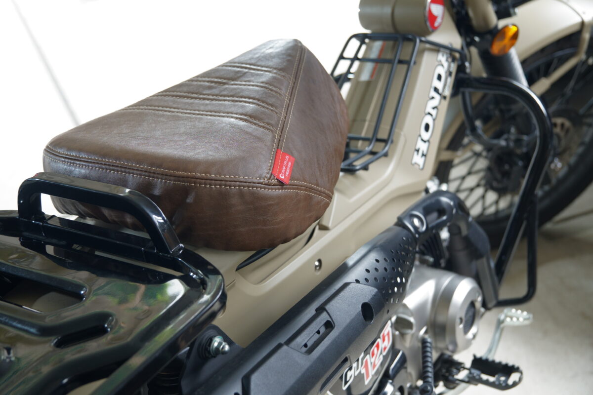 そもそもカブ系の純正シートは肉厚でワイド。その上にかぶせるということも考慮してシートカバーの仕立ては、トップの縫い目にパイピングを持ってくると座り心地が悪いからと、レザーを折り返しシートの縫い目がモモ裏に当たらないように配慮している。さらに生地の裏側にはウレタン生地をラミネートすることで純正とのダブル効果でクッション性もさらに高まるという具合だ。