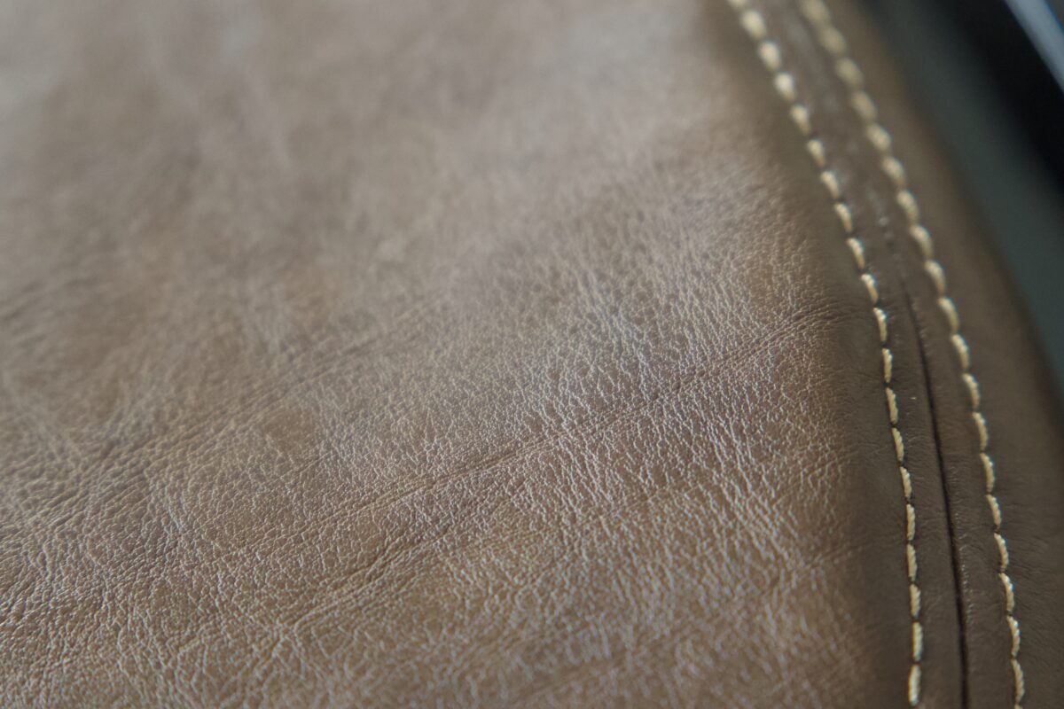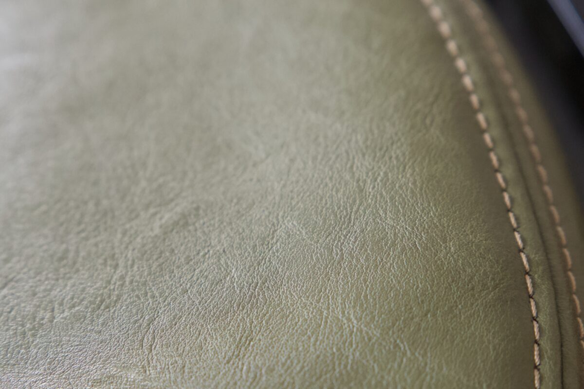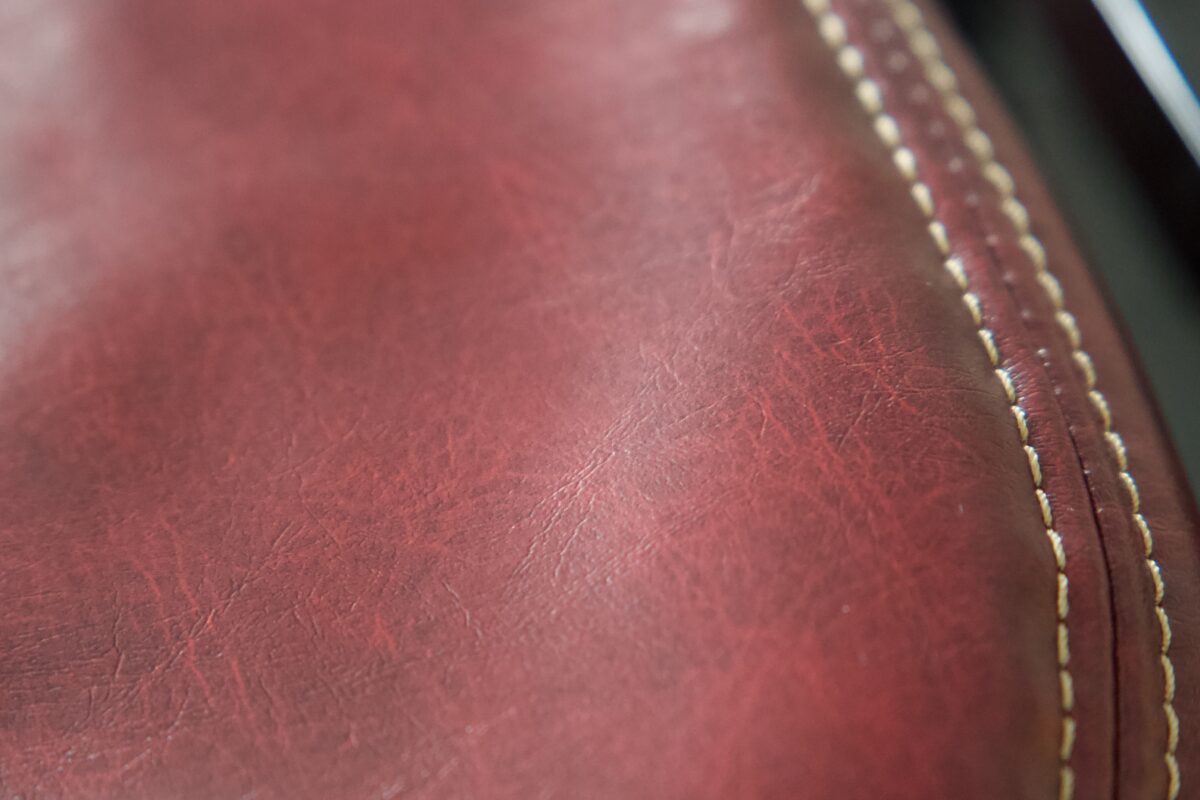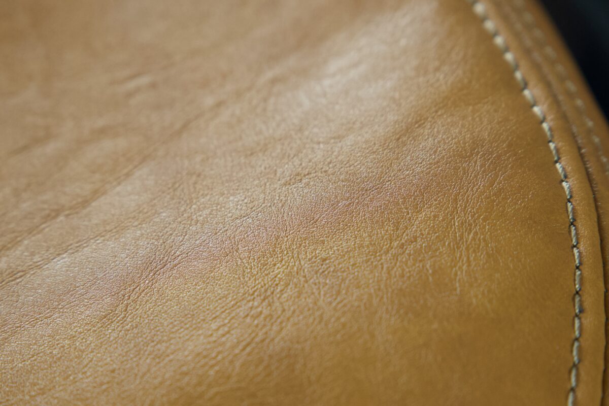まずはオールレザー(合皮)。座面はもちろんシートの厚みとなるサイドのマチの部分を含め全てレザーで構成されている(カラーは4色。ワインレッド、ブラウン、カーキ、キャメル)。