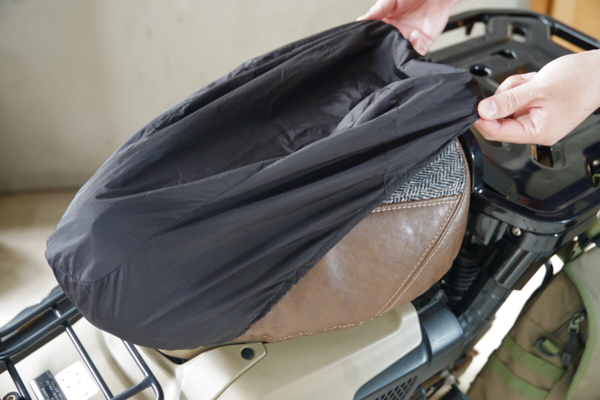 カブ系の純正のシートは90度開閉するスタイルのため、そのままでも装着はできる。しかし、よりフィット感を高めたいのなら、シートを外した状態でシートカバーを被せれば一体感はより高まる。