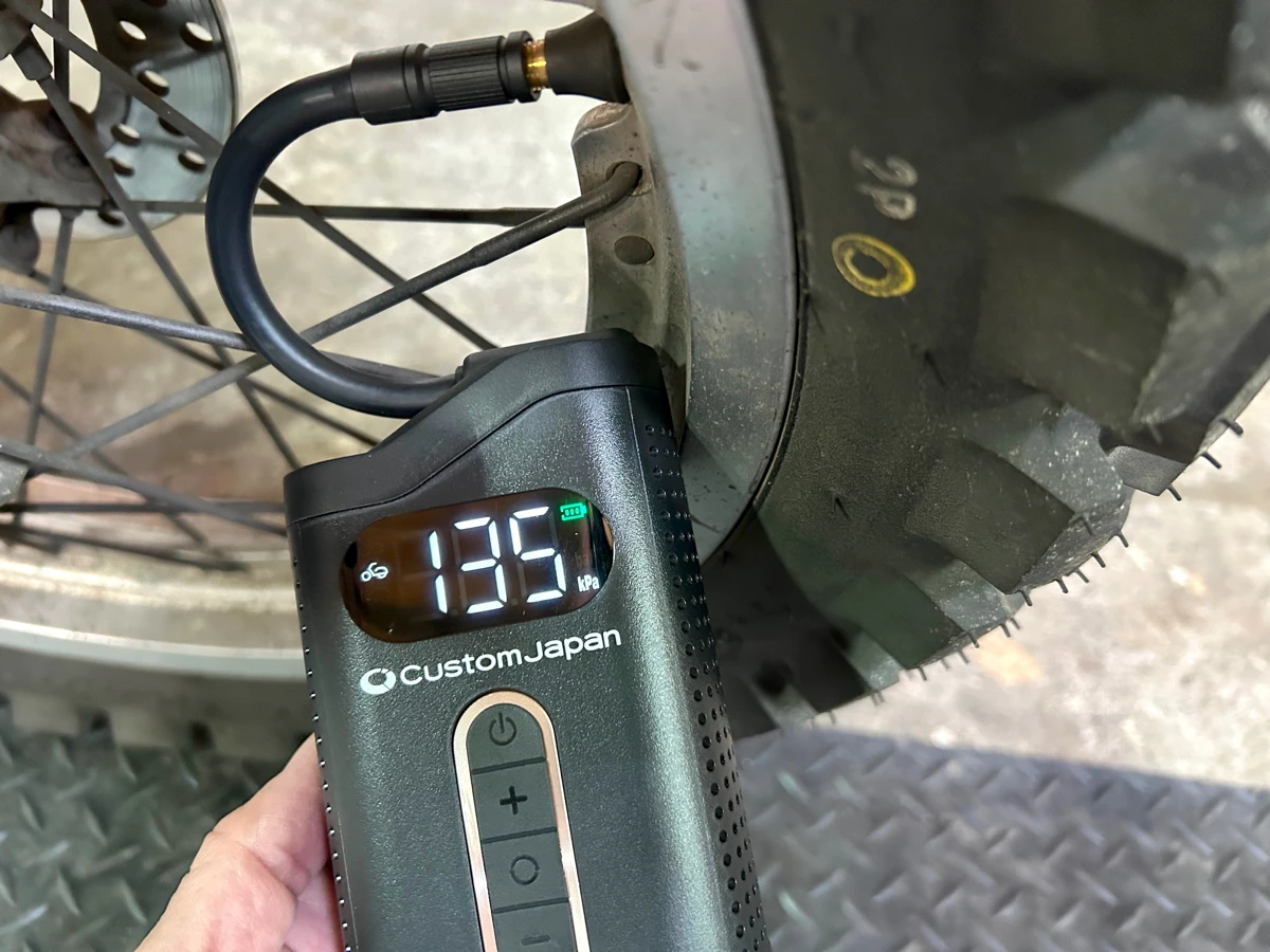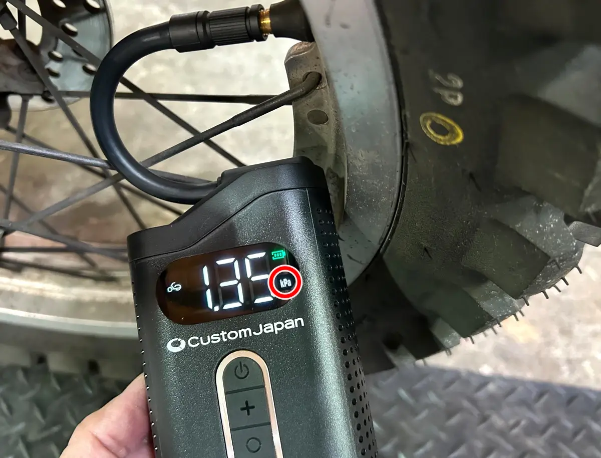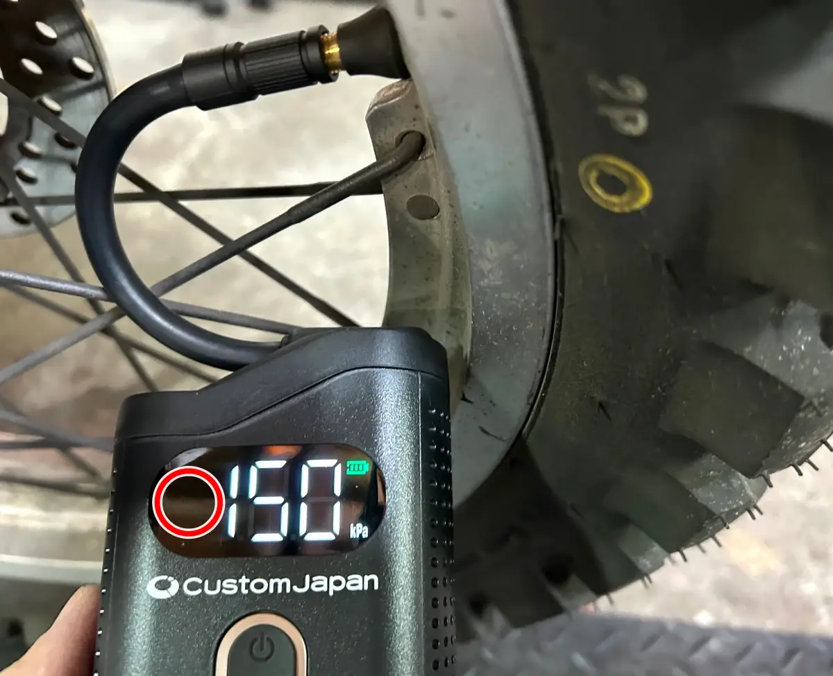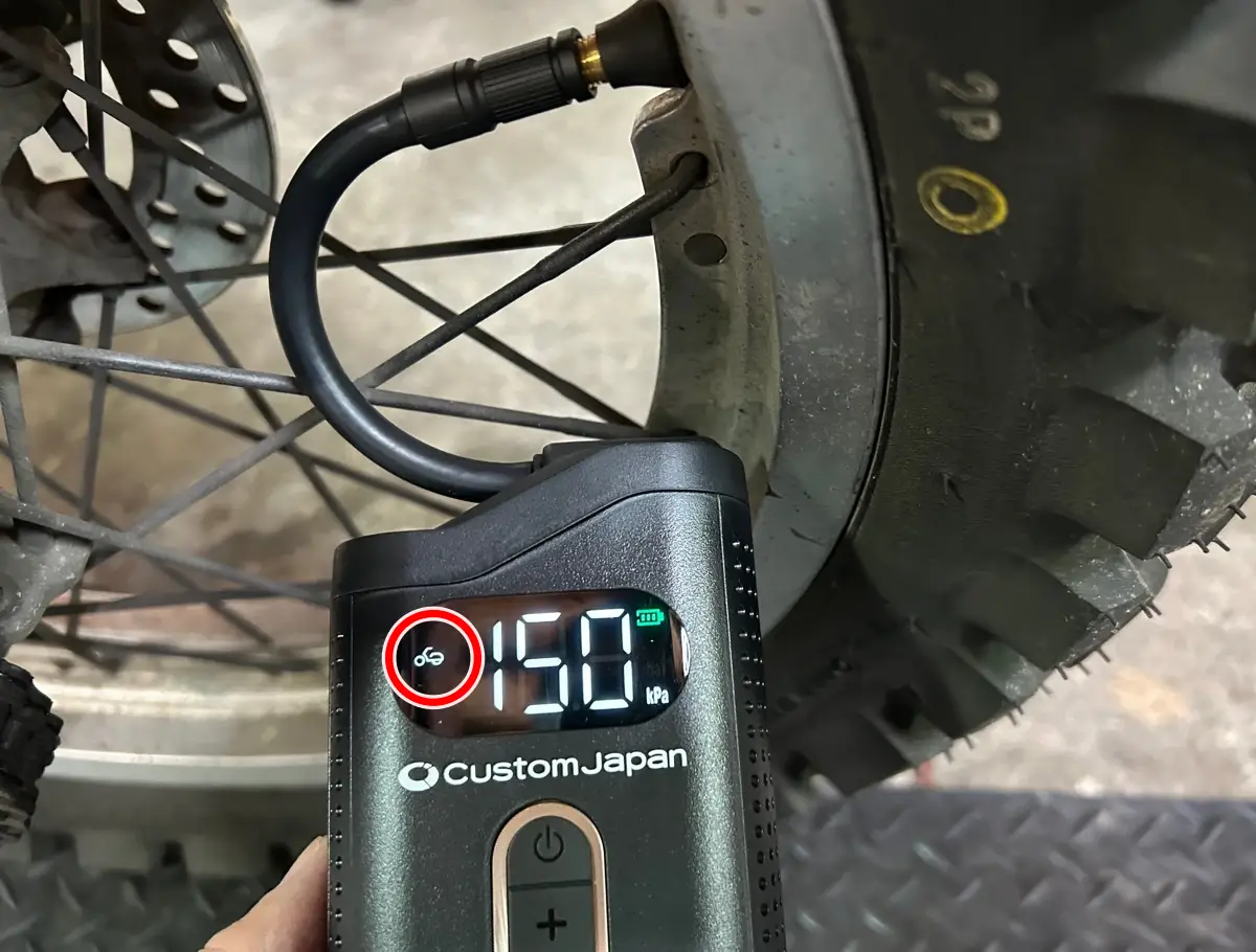ってことで、無事に150kPaに設定した上でエア注入!が完了したわけですが…なんでも肯定ではなく疑いから入る僕(最悪やな)としては…バイクモード設定なしの150kPaは、本当にバイクのタイヤで150kPaになっているのか?となかなか際どい疑いを抱いてしまったので…試しにバイクモードに設定した上で空気圧を確認したところ、ちゃんと150kPaになっていたことをご報告いたします。