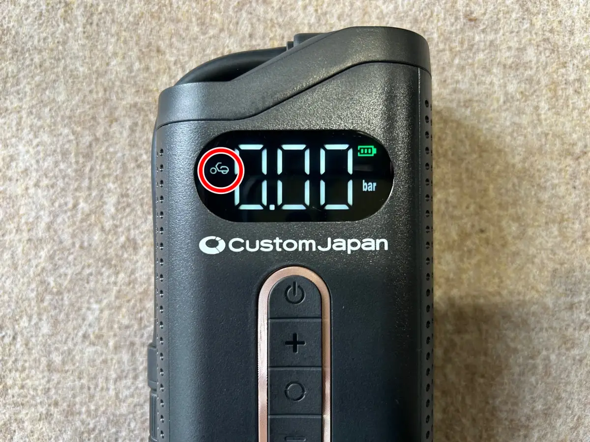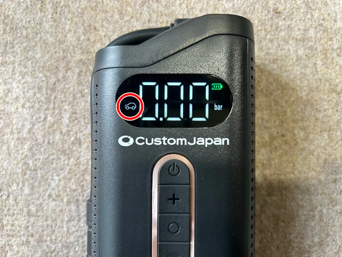 例えば車のタイヤに空気を入れる際は車モード(車のアイコン)に、同じく自転車の場合は自転車モード(自転車のアイコン)にボタン一発で切り替えるだけでOKなんです。