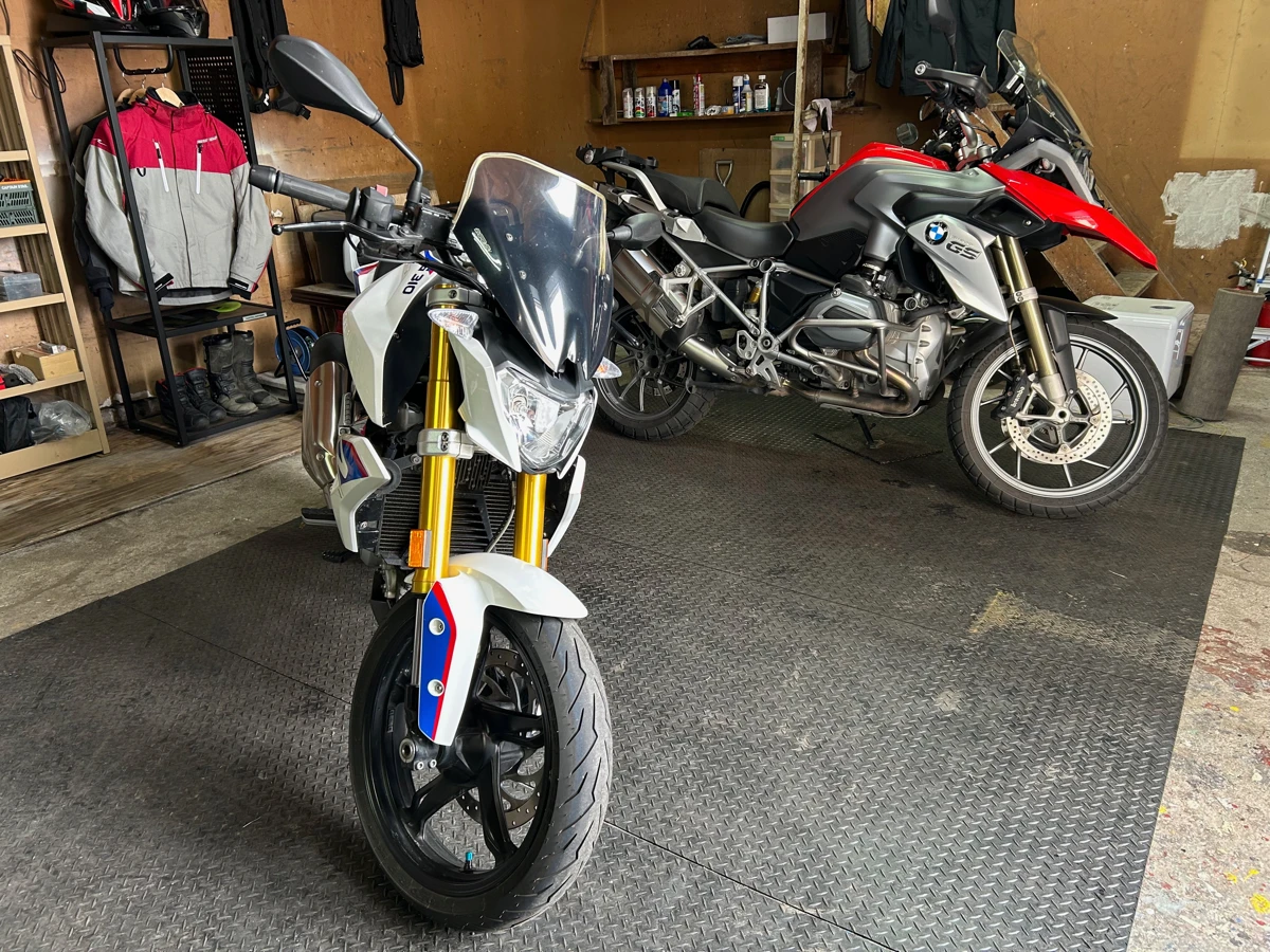 それに伴いまずは実際に空気を入れた車両の紹介ですが、BMW R1200GS(アドベンチャー)、BMW G310R(ネイキッド)、YAMAHA セロー225WE(オフ車)、謎のDUCATI自転車、ダイハツ タフト(軽自動車)の5台となっております。