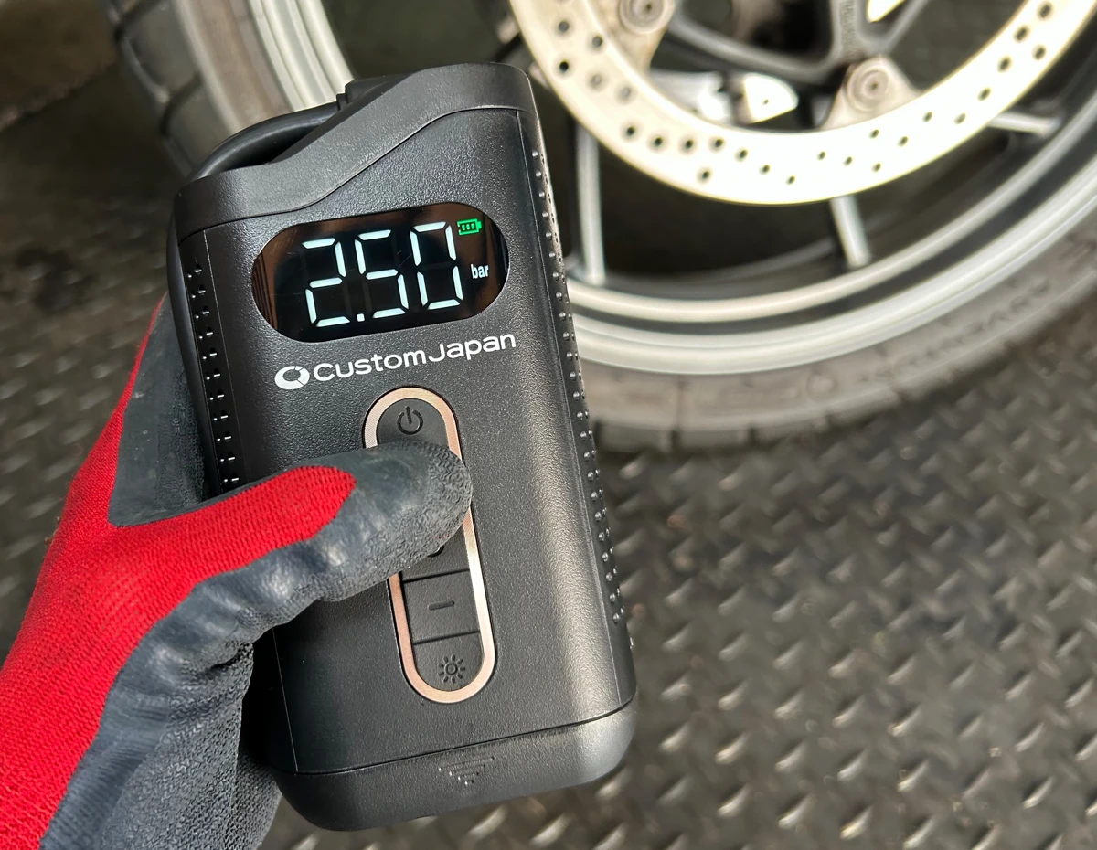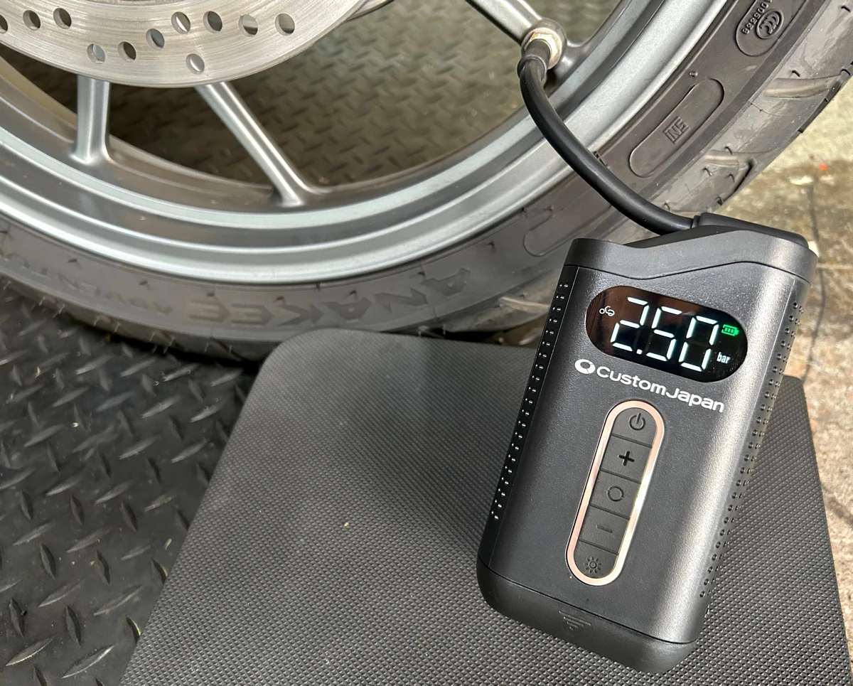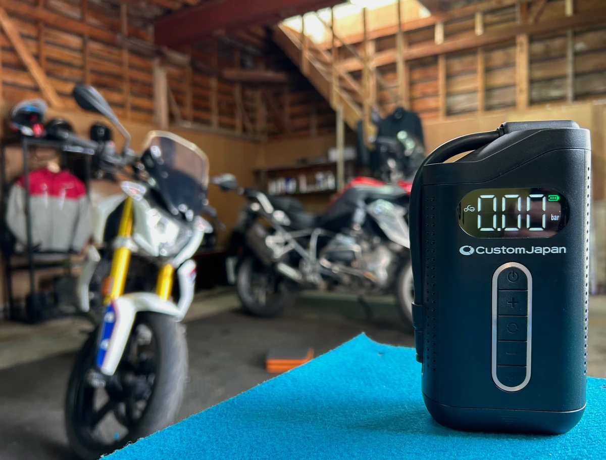 発売元は東京モーターサイクルショーにも出展している「SHAD・TIMSUN」の日本総代理店で、数多くのプライベートブランドを展開しているカスタムジャパンで、軽量コンパクト設計かつコードレス仕様な電動空気入れとなっているので、まさにツーリングのお供として最適なんです!