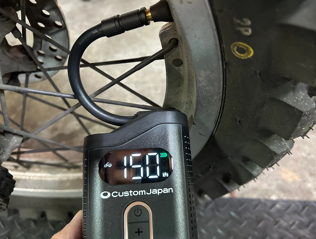 さて、デジタルの信頼性を担保できたところで、お次はセローちゃんのリアタイヤの空気入れですが、これの規定値は「150kPa」となっているので、スマートエアーマルチポンプを「バイクモード+kPa」に設定いたしました。
