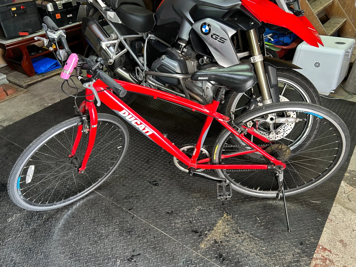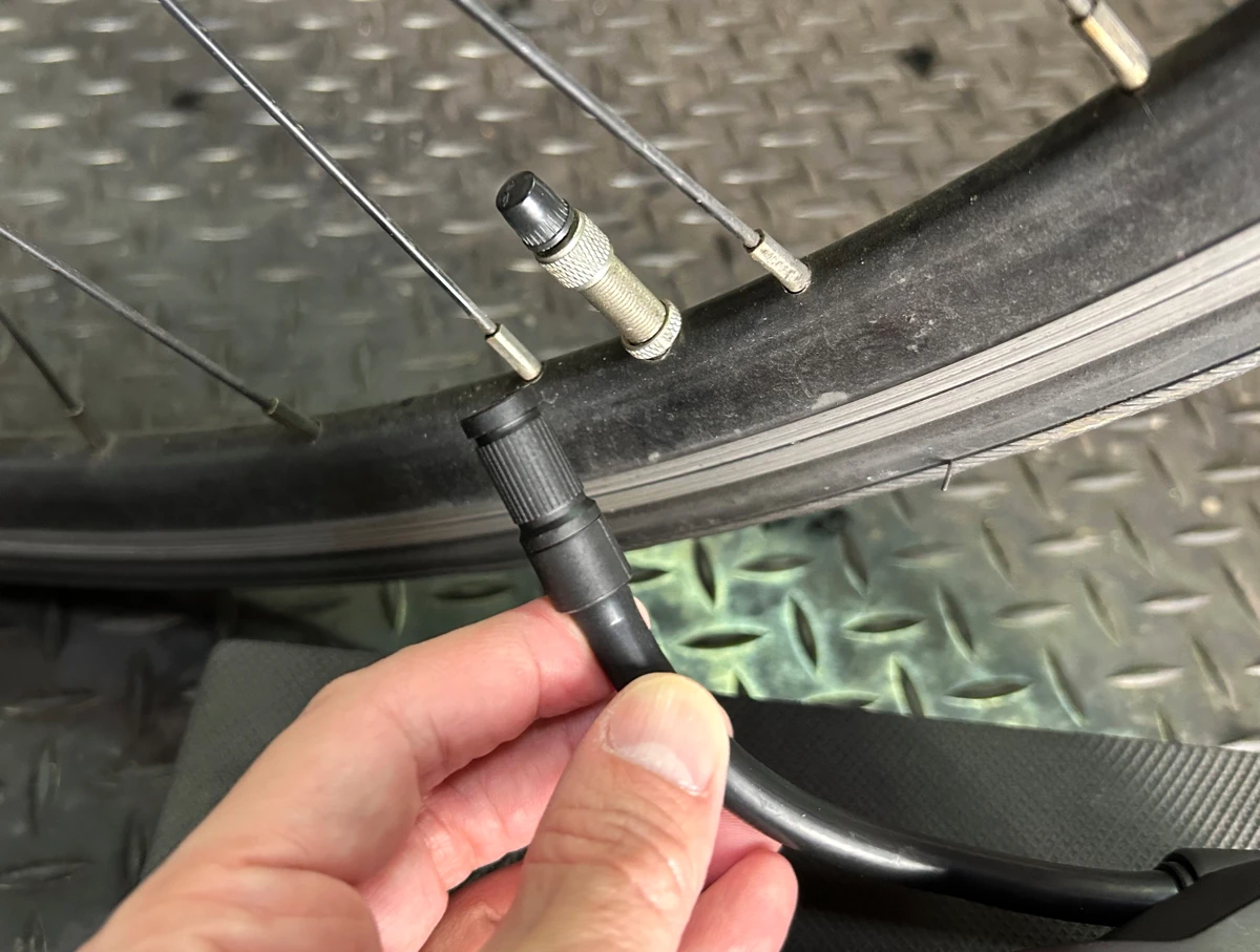 さてさて、お次は謎のDUCATI自転車へのエア注入ですが、基本的に自転車のエアバルブは「英式・仏式バルブ」であって、バイクや車の「米式バルブ」とは異なります。