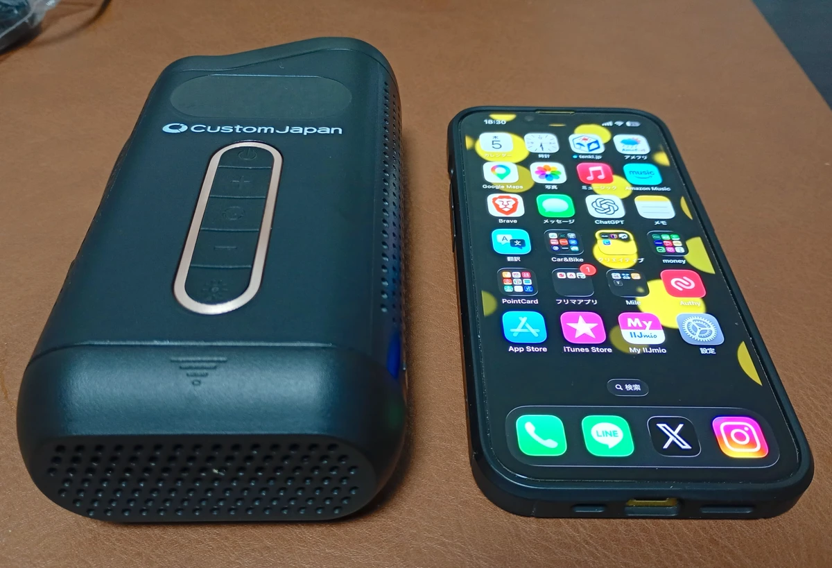 iPhone14(カバー付き)とほぼ同じ大きさ、厚さは2.5倍くらい