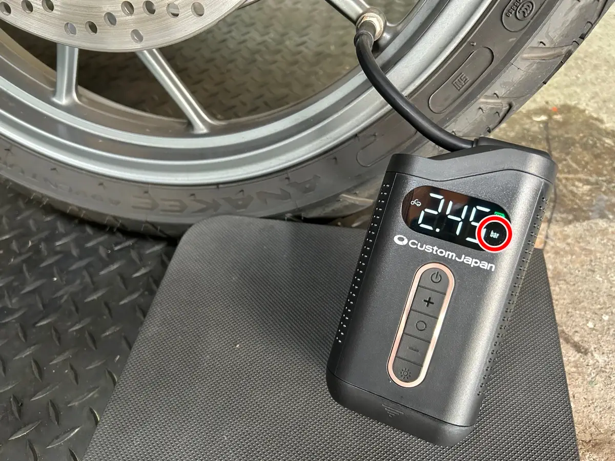手始めにGSのフロントタイヤは規定値の「2.5bar」に対して「2.45bar」と表示されたので、スマートエアーマルチポンプの設定値を2.5barにしていざ!エア注入!