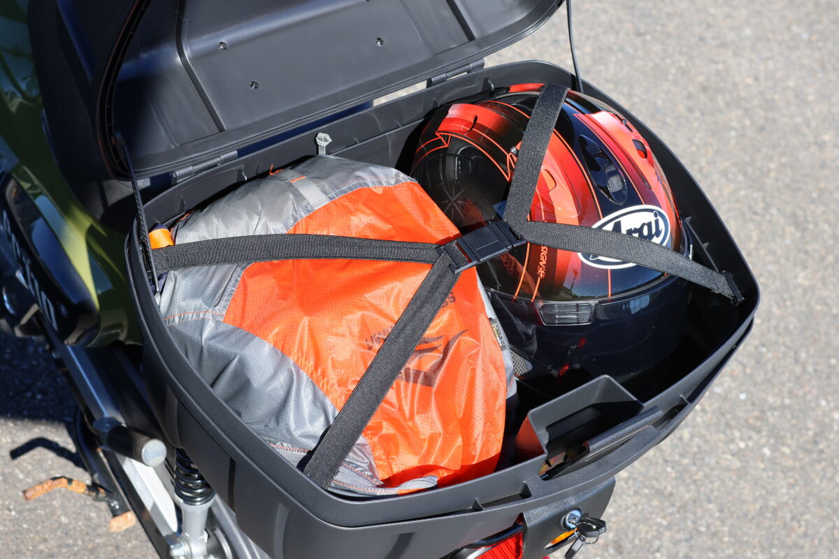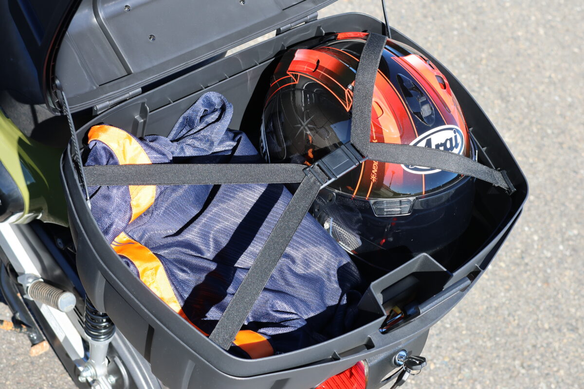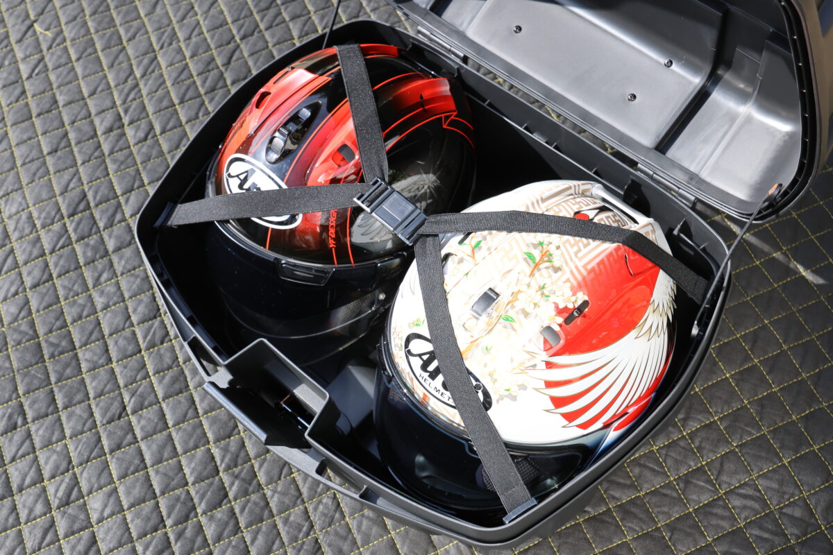 容量的にはヘルメット2個、もしくはヘルメット1個とジャケット、さらに小ぶりなデイパックやレインウエアなどを入れてもまだまだ余裕がある感じ。これだけの容量があれば日帰りやタンデムでの宿泊ツーリングなら困ることはなく、荷物がコンパクトならキャンプツーリングにだって使えそうだ。