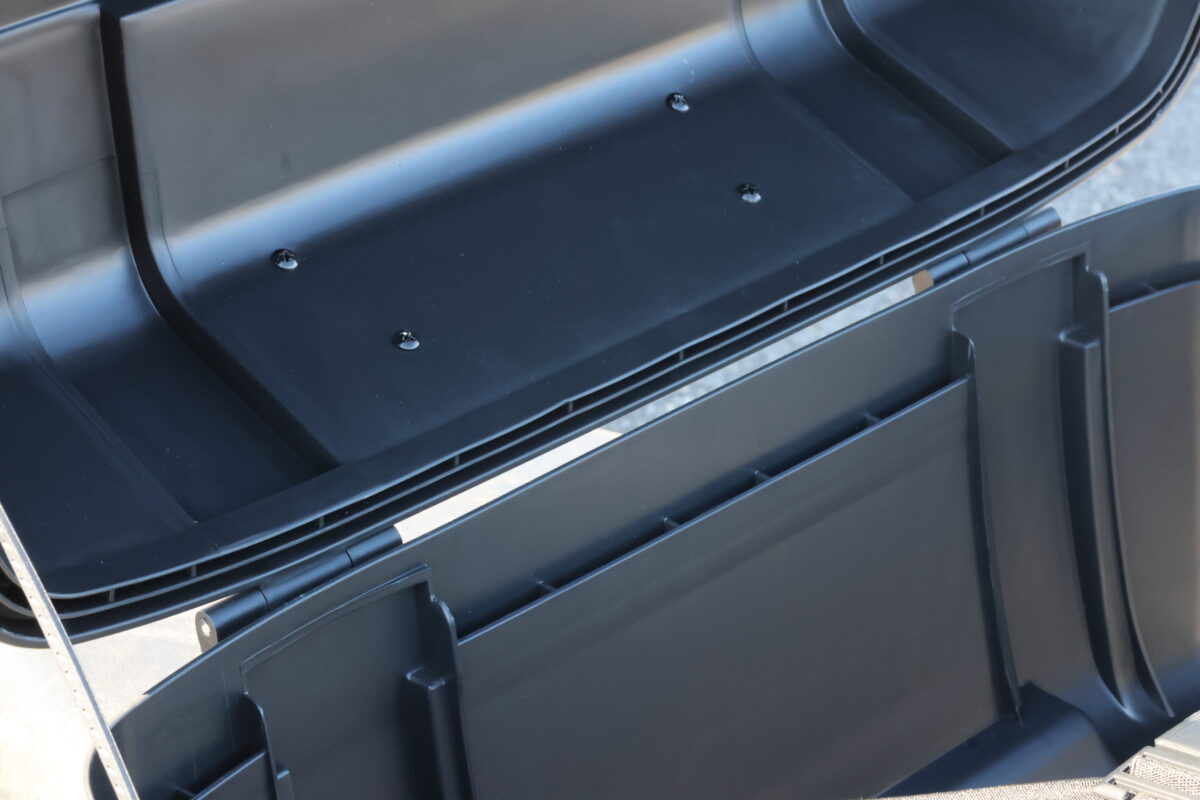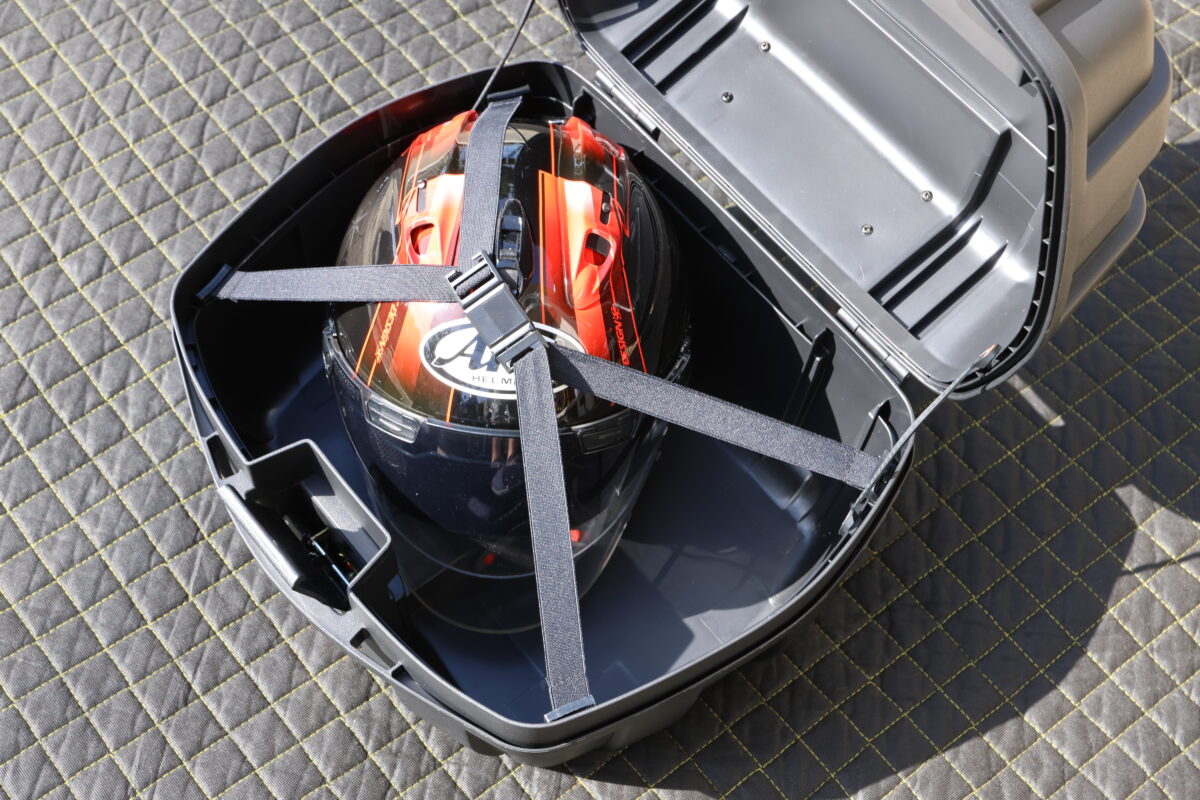 内部を見てみると内部形状が直方体(幅530×奥行き390×高さ300㎜)に近く、いかにも荷物が入れやすそう。今回は収納するヘルメット種類も色々試してみたが、ジェットヘルメットやフルフェイスヘルメットがすっぽり収まり、オフロードタイプや大型のバイザー付きのヘルメットだと閉まらなくもないが、ややバイザー部分がやや接触するという感じのサイズなのでバイザーが割れないように注意が必要だ。