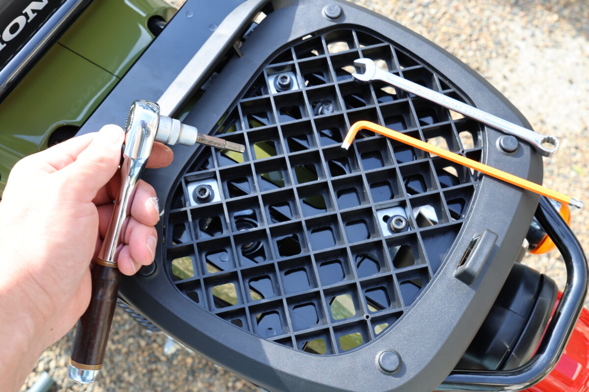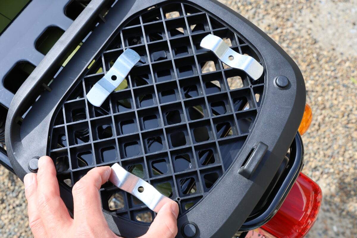 実際に作業してみると、クロスカブ110の場合確かに取り付けベースの位置決めにはちょっと頭を使った。というのもベースのどの穴を使って固定するかは取り付けるキャリアの形状に左右され、ちょうどいい取り付け場所を探す必要があるのだ。