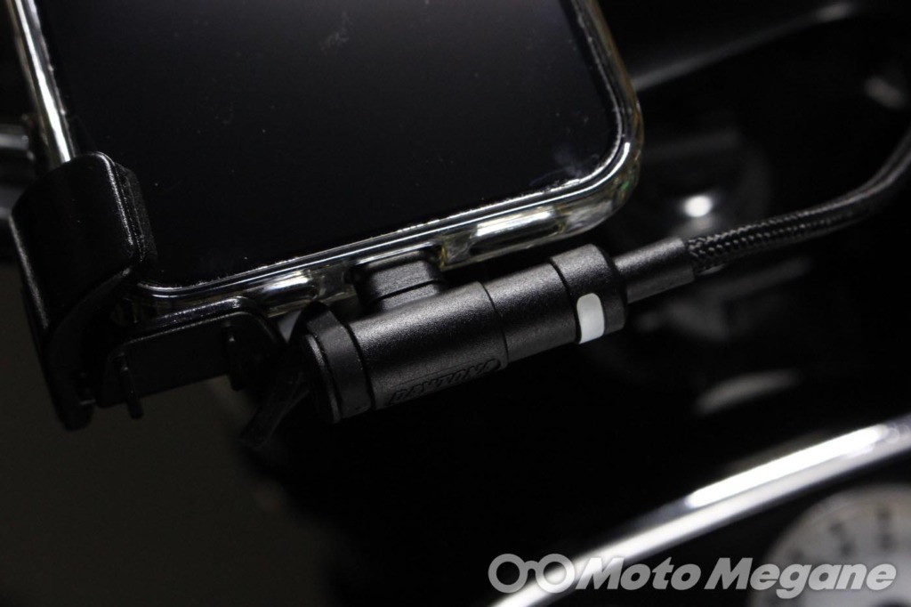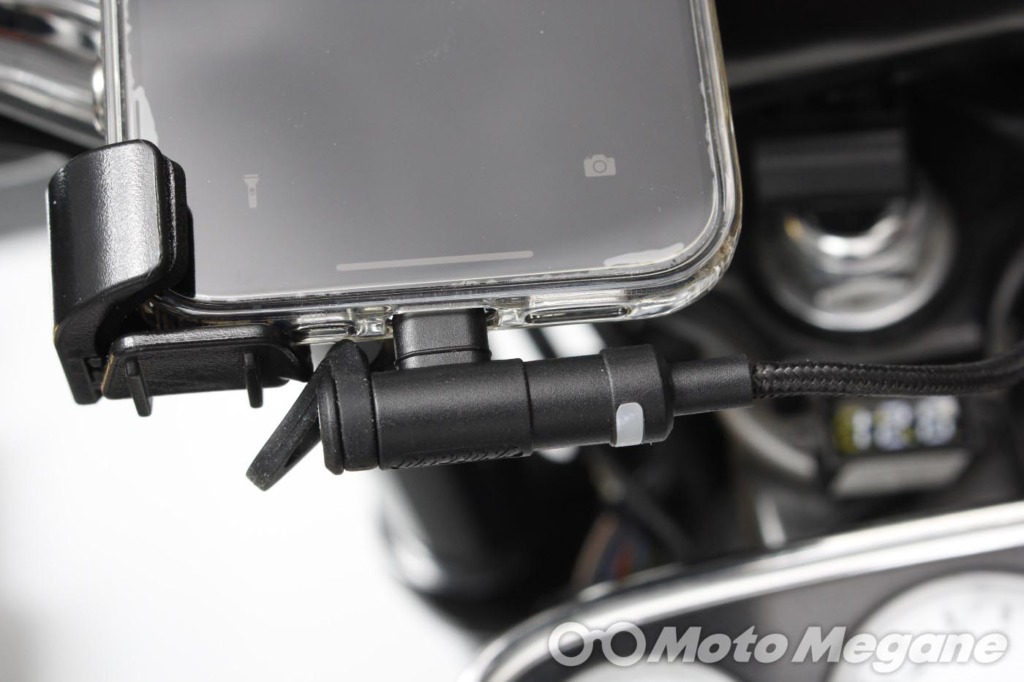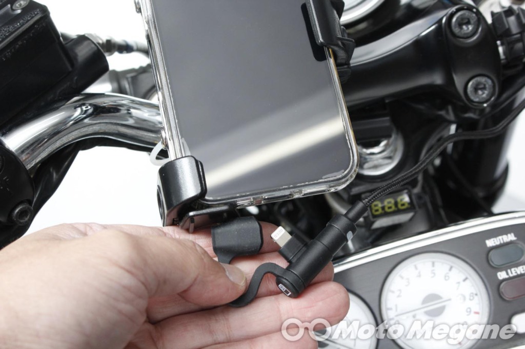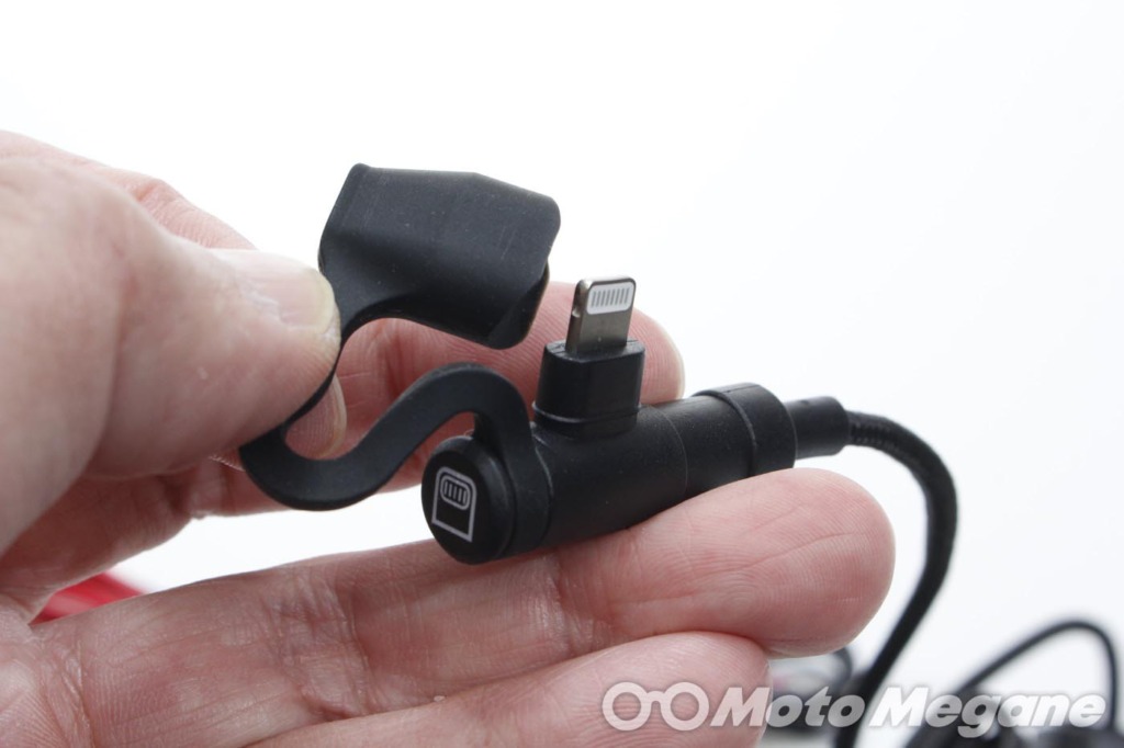 Lightningコネクターは、L字タイプなので燃料タンクなどにも干渉しにくい。コネクター先端にLightningイラストが入っている。ケーブルを複数装着するならこういった識別は便利。