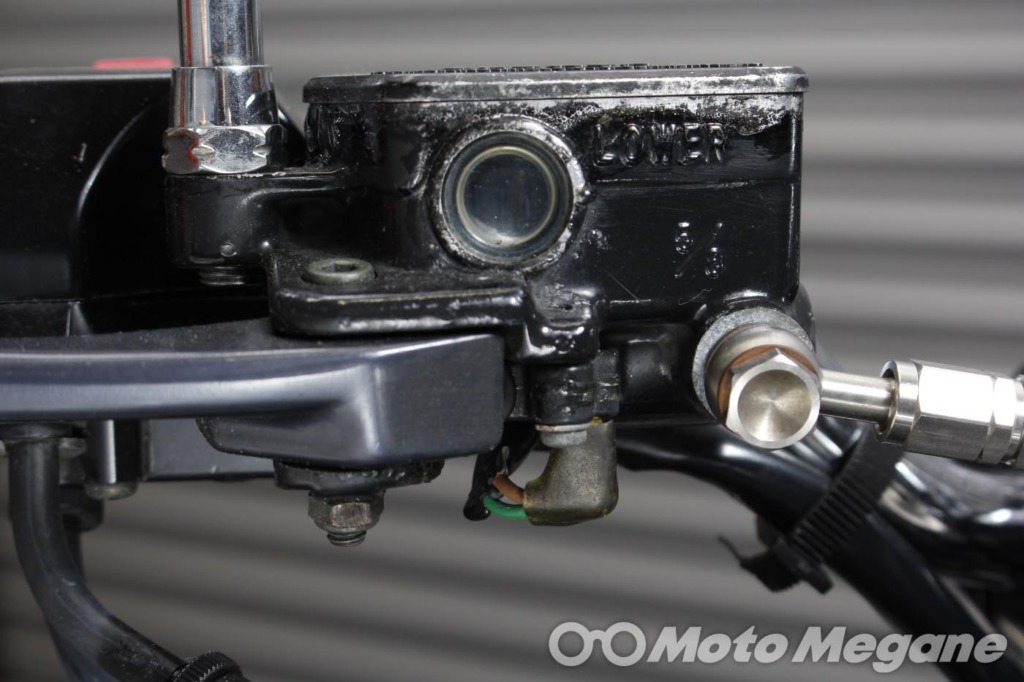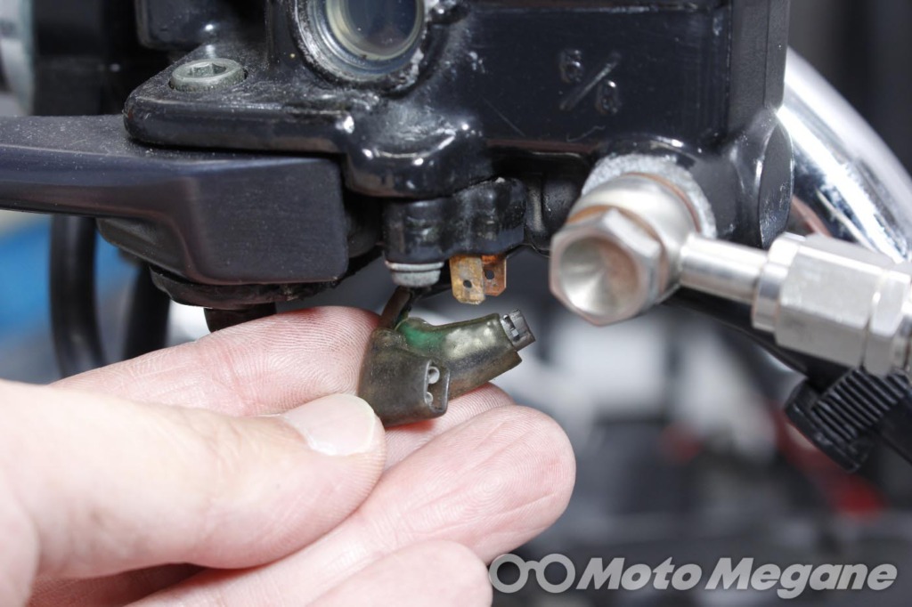ブレーキスイッチはマスタシリンダー下側に付いている。まずは配線を外すが、コードではなく端子部分をつかんで引き抜く。