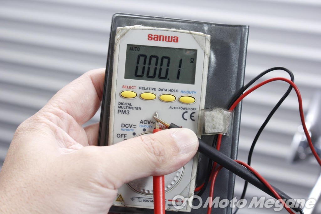 一般的にオートバイや車はフレームをマイナスの電気の通り道として使っており、それをボディアースと呼んでいる。テスターをΩの位置に合わせて、バッテリーマイナス端子と充電電源のマイナスを接続したいボディの任意の場所にそれぞれテスターリードを当てて導通があるかどうかを確認できる。