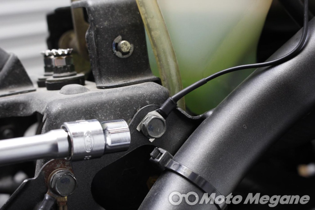 アースが落ちているボルトに黒線のクワ型端子を共締めする。基本的にフレームのボルトにはアースが落ちている。