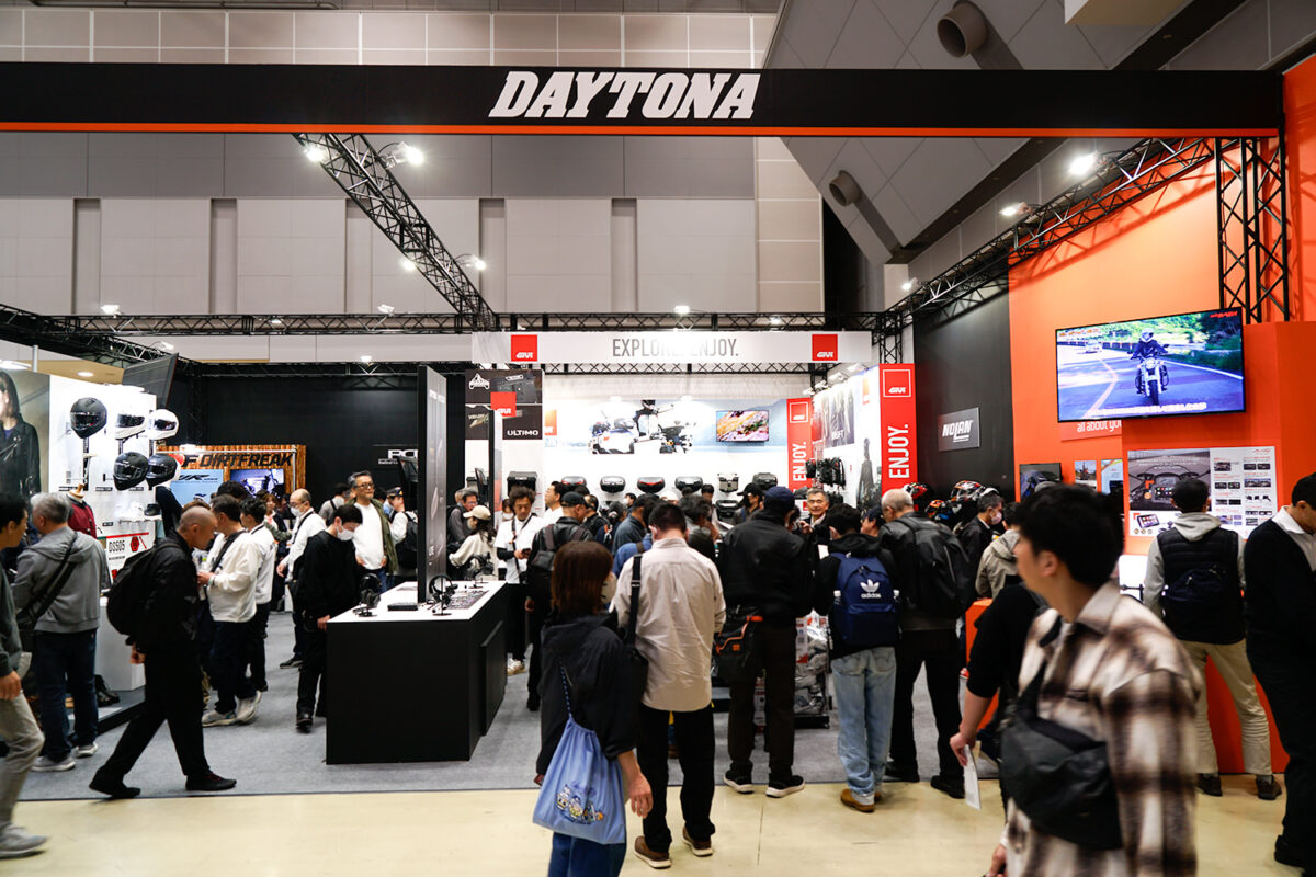 初公開となるデイトナ新インカムなどデバイスからアパレルまで自社開発製品ほか豊富な展示でブースは大賑わい
