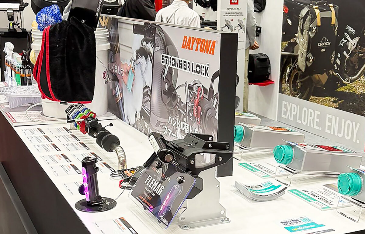 デイトナブースでは、独自技術であるDuoSync(デュオシンク)搭載の次世代バイク用インカム「RESOインカム」、Henly Beginsツーリングバッグ、GRエクスプロア スマートフォンマウントなどのツーリング用品やカスタムパーツ、デイトナアパレルのライディングギアやアウトドアギアに加え、洗車ケミカルやMOTOREXオイルなどのメンテナンス用品など新商品がズラリ。