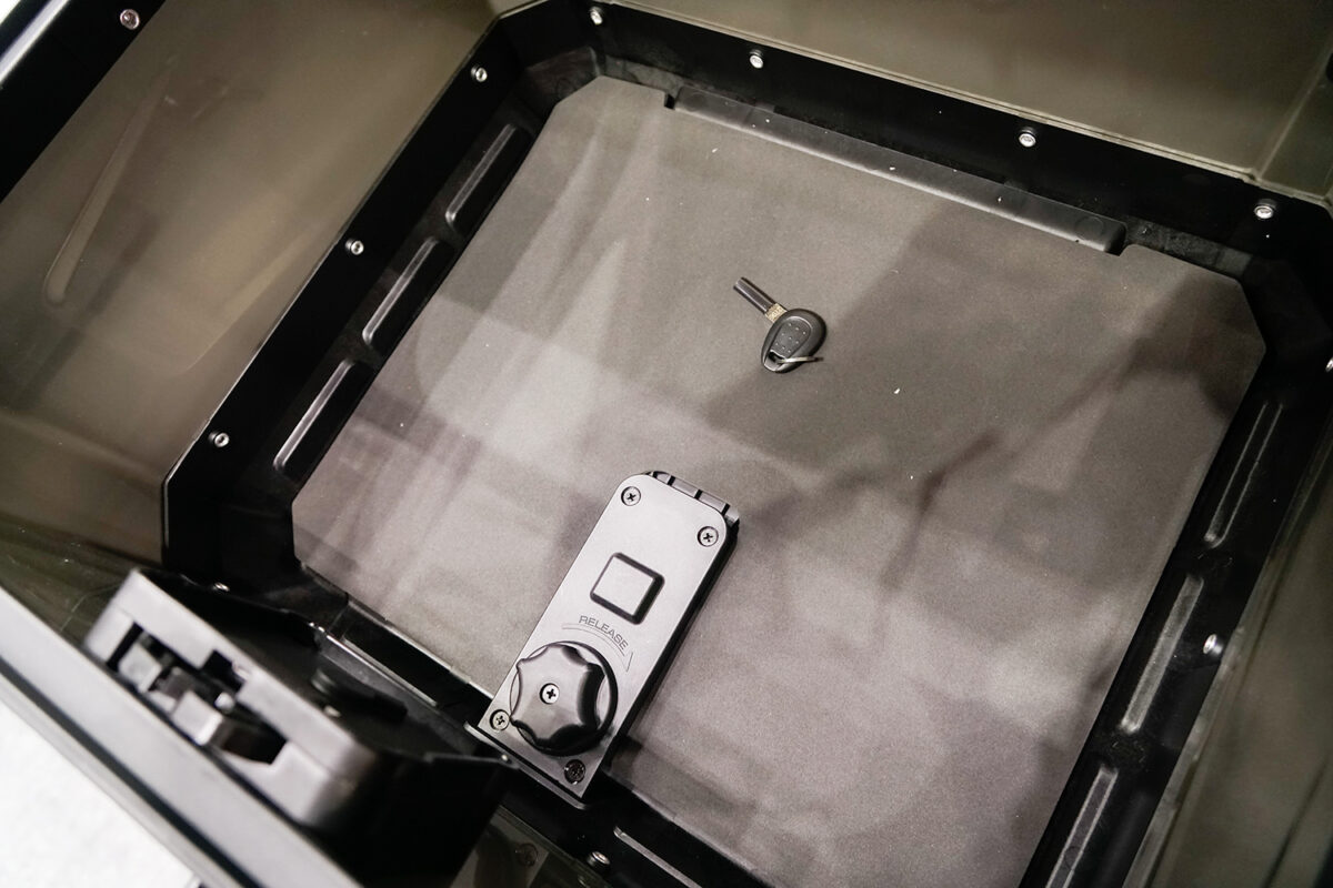 耐久性や積載性に優れるほか、ベースからの脱着はボックス内側から操作するので防犯性も高い構造になっている。また、上蓋に4カ所のベルトループを備え、シートバッグなどをフタの上に積載可能。