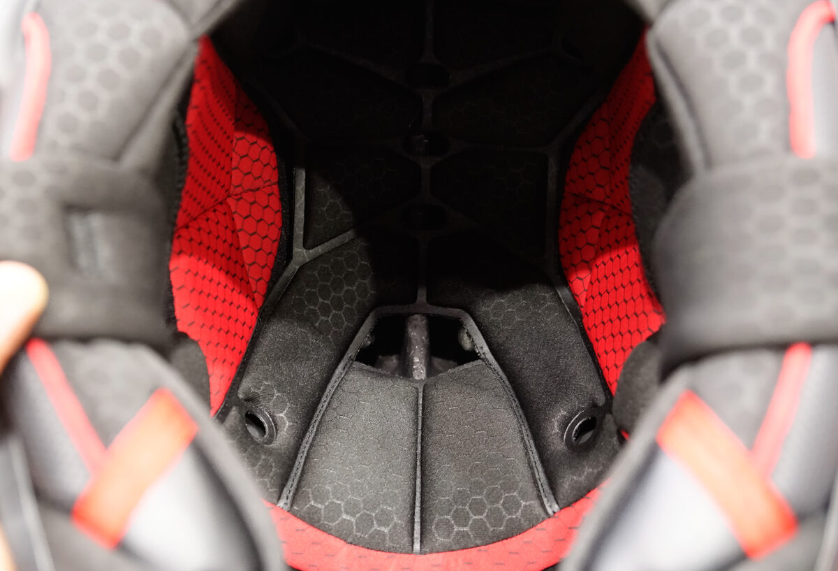 持った瞬間にびっくりするほど重さを感じさせない理由は、カーボン採用に加えてライナーの発砲スチロールに刻まれた縦の溝。この縦に刻まれた溝によって穴抜きのような軽量化効果+ヘルメット内の空調も良好に保たれるのだ。