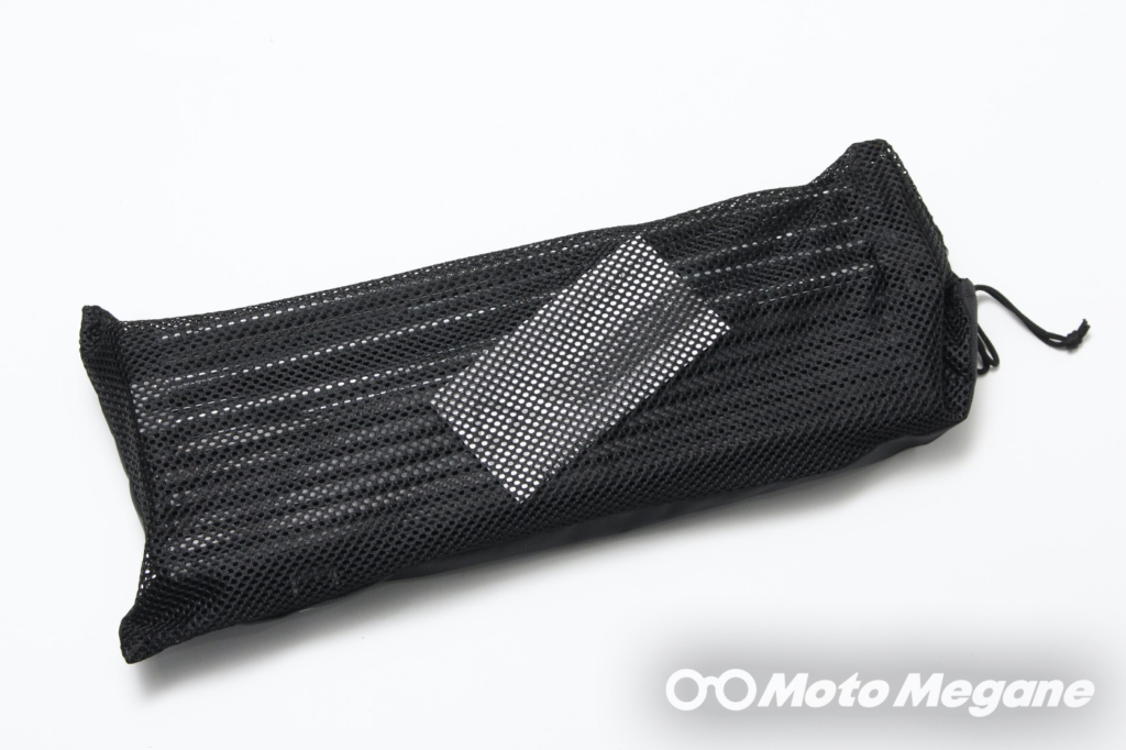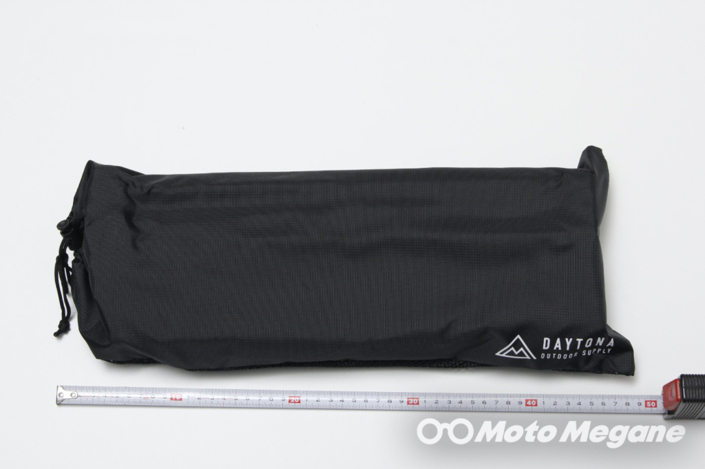 収納状態でメーカー公表サイズだと12×43×10cmとなる。袋を入れるともうひとまわり大きくなる感じだ。しかし、ツーリング用のシートバッグにはたいてい収まるサイズだと思う。
