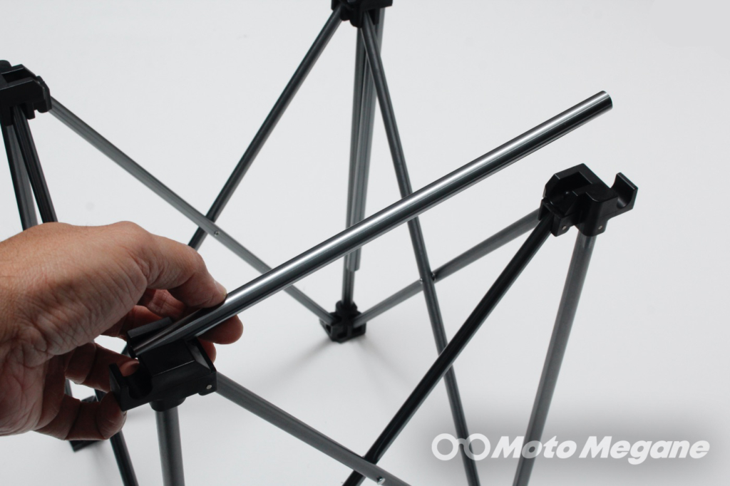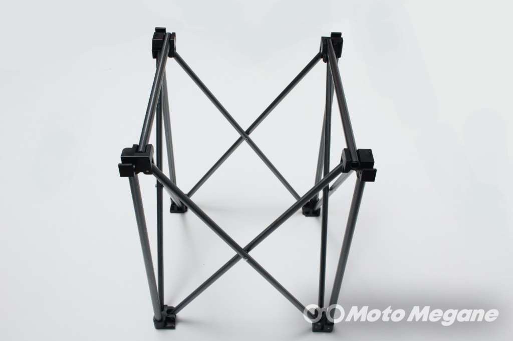 脚のフレームが組み上がった状態。平坦なところならば、しっかりとした安定感が感じられる。ちなみに脚の状態で耐荷重は100Kgもある!