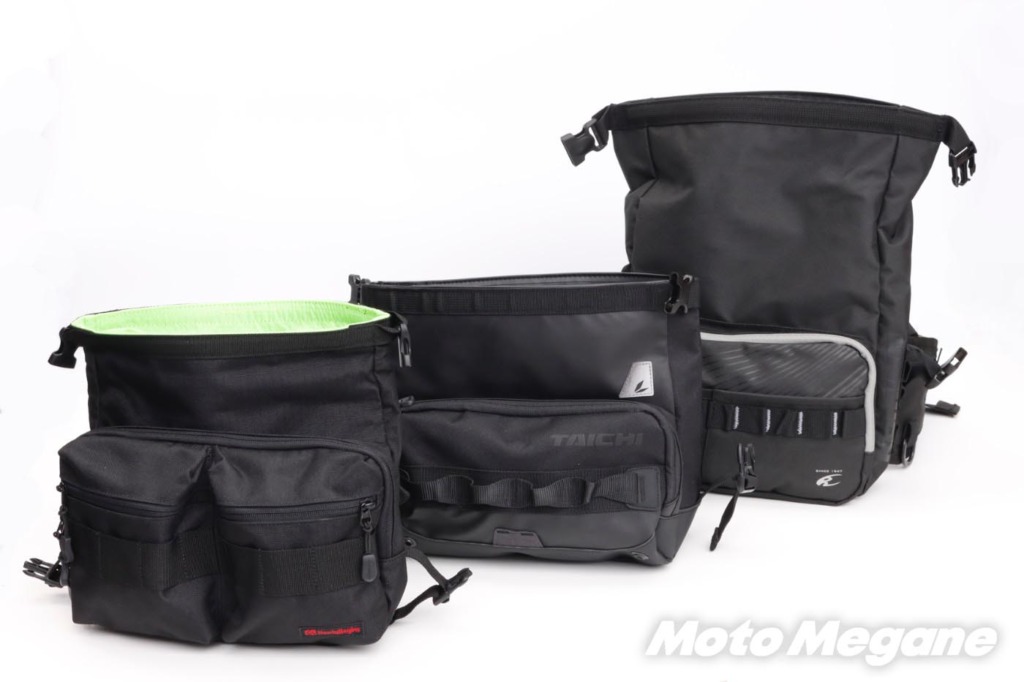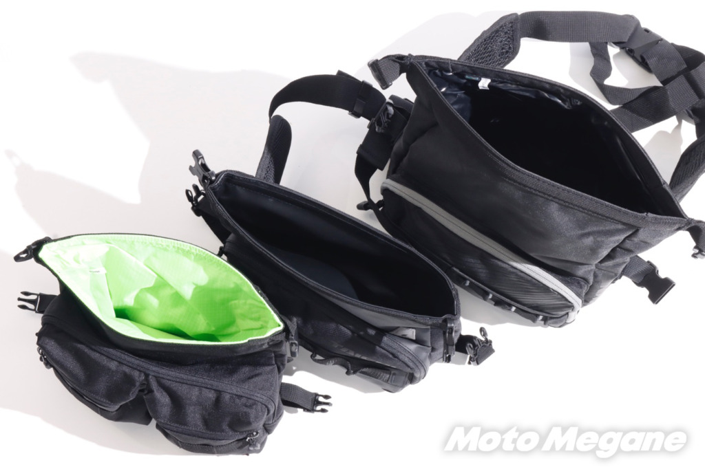 写真左からヘンリービギンズのDH-737、RSタイチWPヒップバッグ RSB279、KOMINE SA-243ウォータープルーフウエストバッグ5ℓとなる。