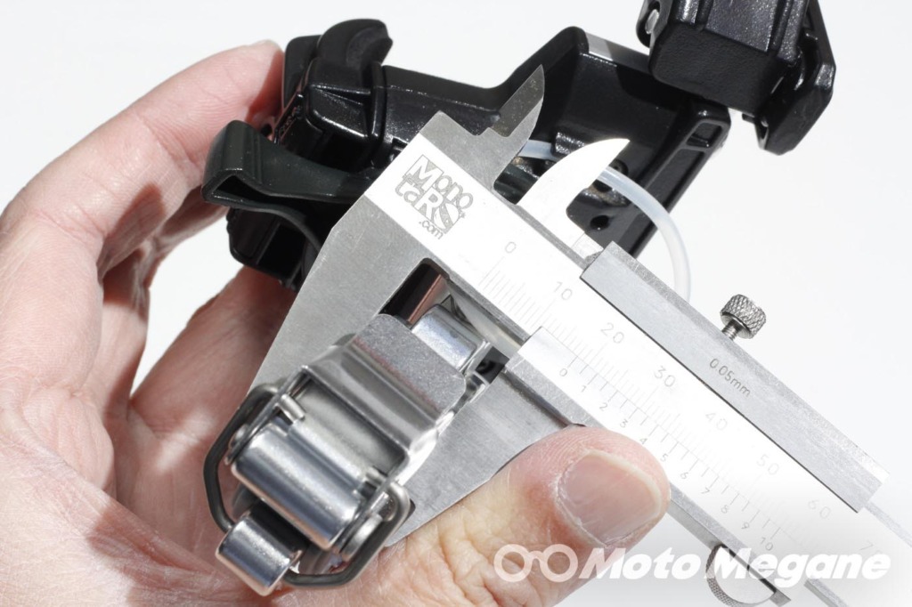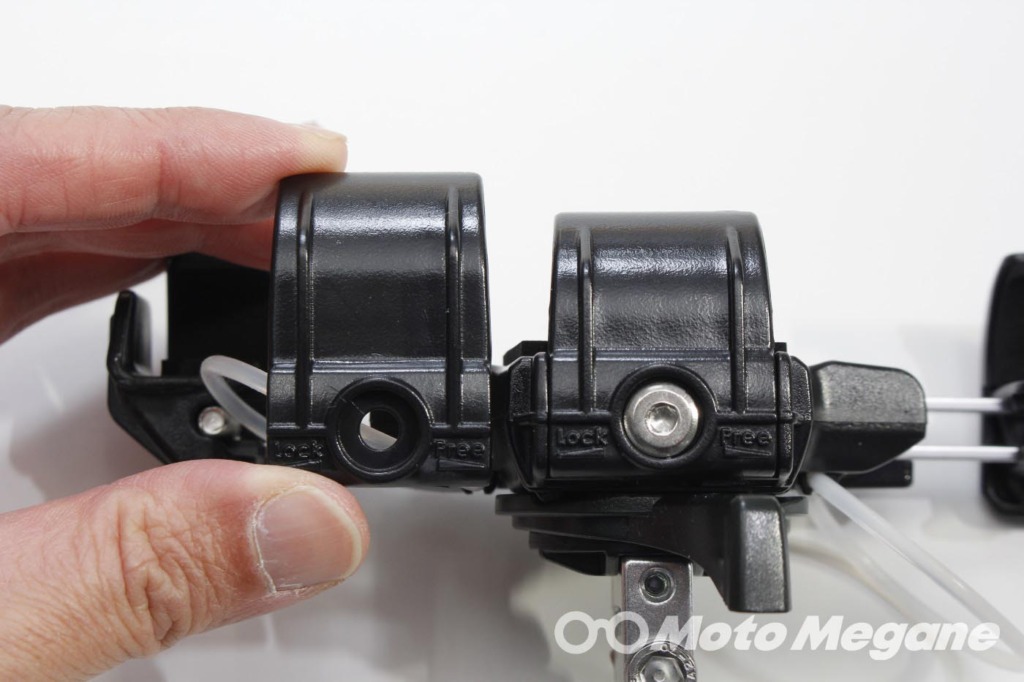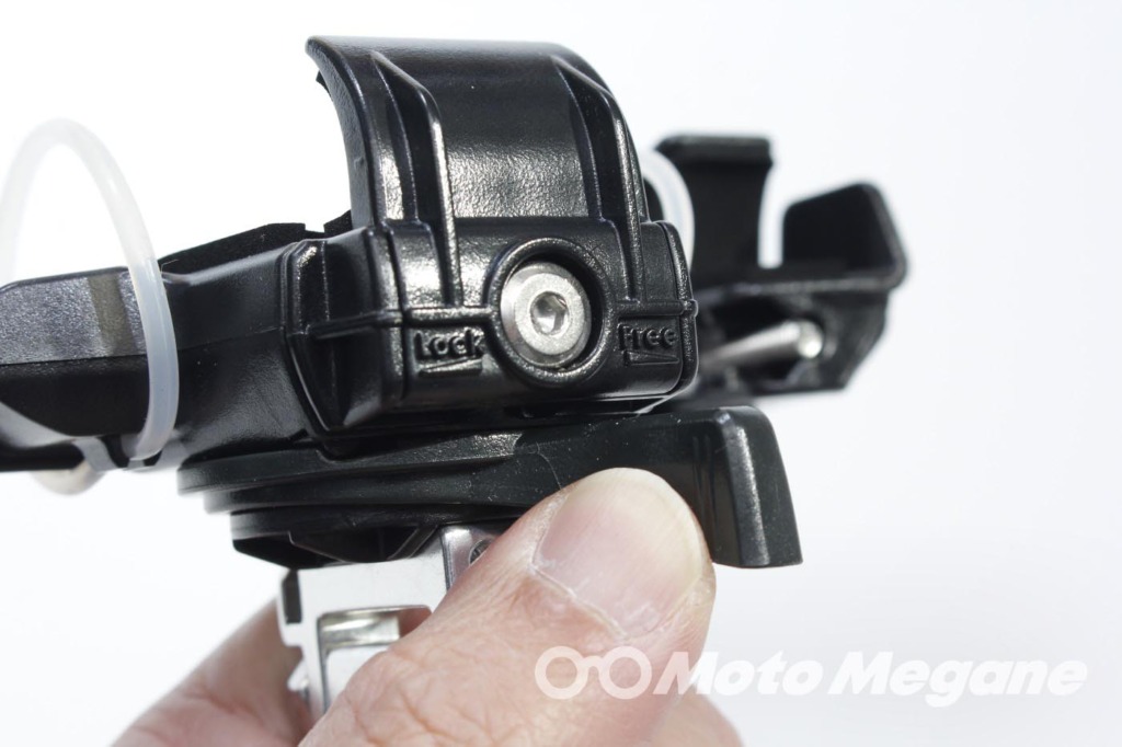 スプリングでテンションがかかった可動式アームにはロックレバーを装備。これがしっかりしているし、グローブの手でも操作しやすい形状になっている。