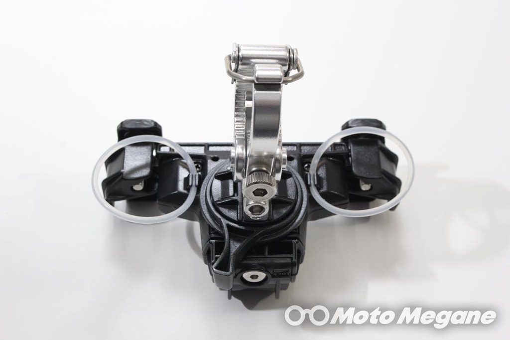 今回紹介するハンドルマウントには別バリエーションで恒久設置の意味合いが強いボルトクランプ式もあるが、ここでは工具無しで脱着できるバックル式のクイッククランプタイプを紹介したい。