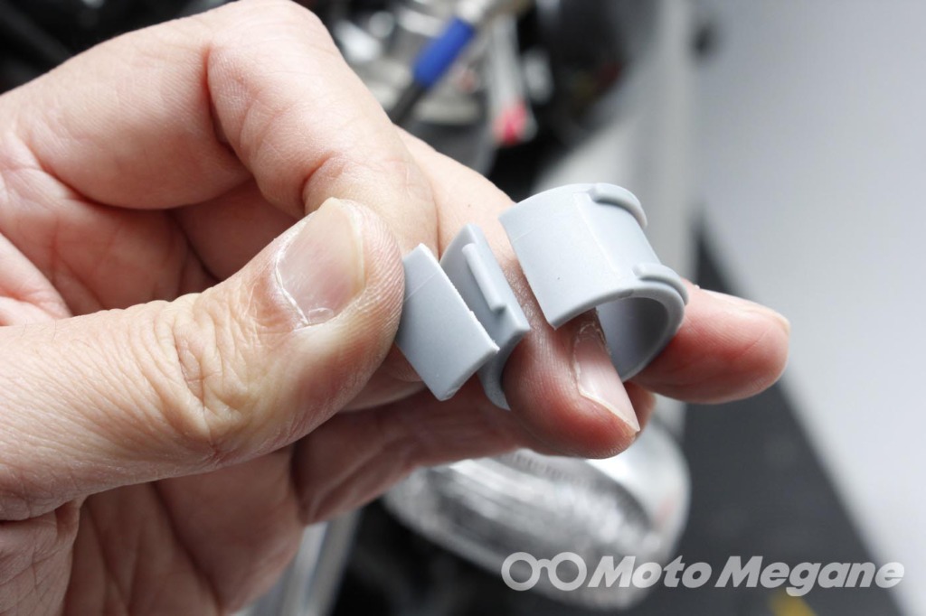 ハンドルに直接クランプすると傷が入ることもあるので、スペーサーが同梱されている。22.2mmハンドルに装着するにはスペーサーが長いので、ハンドルに合わせて余分をカットする。