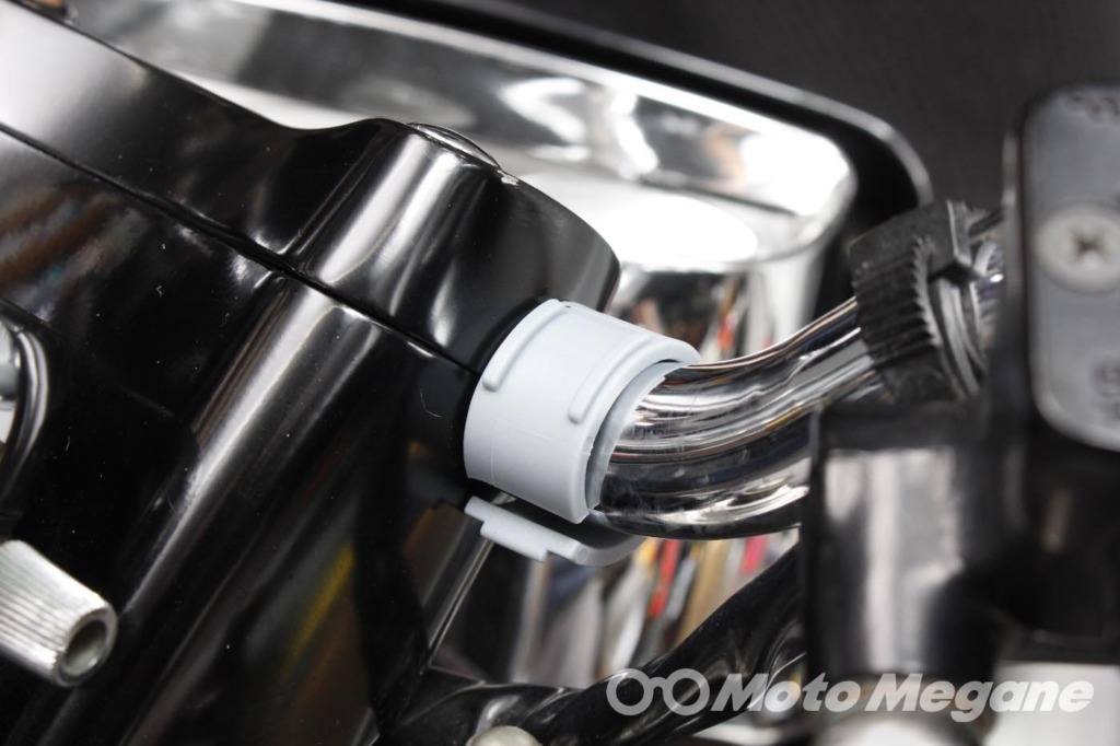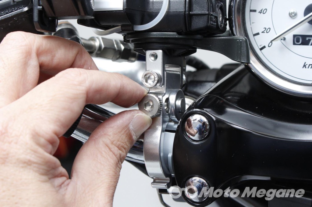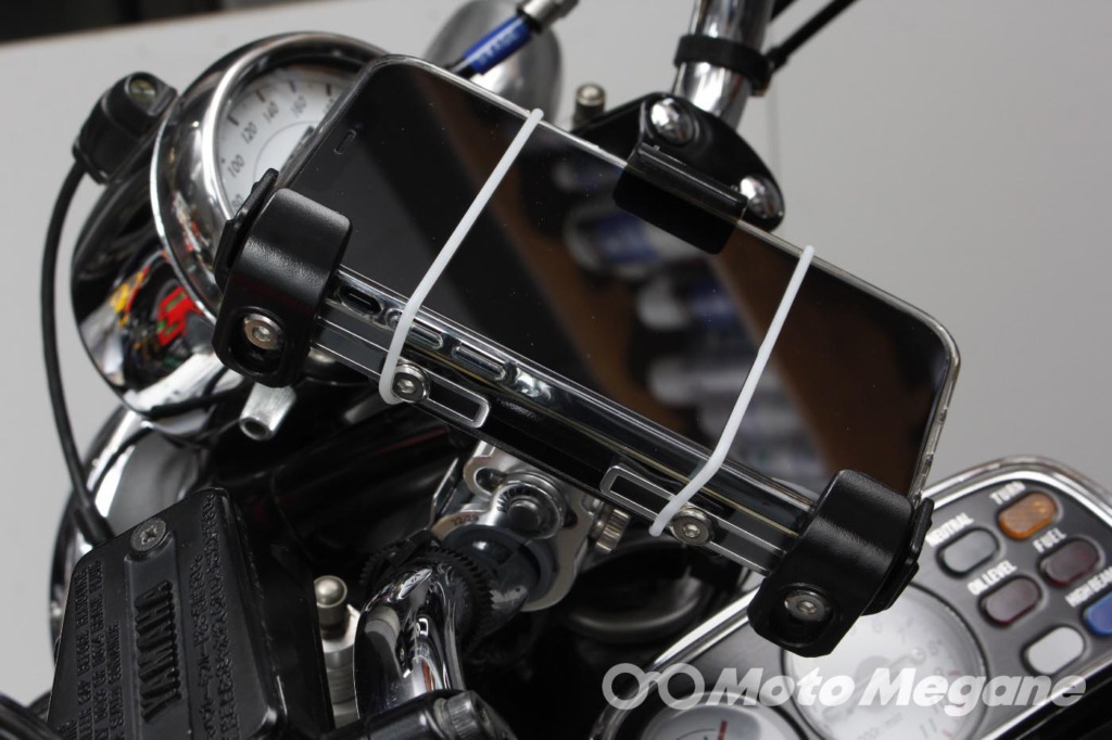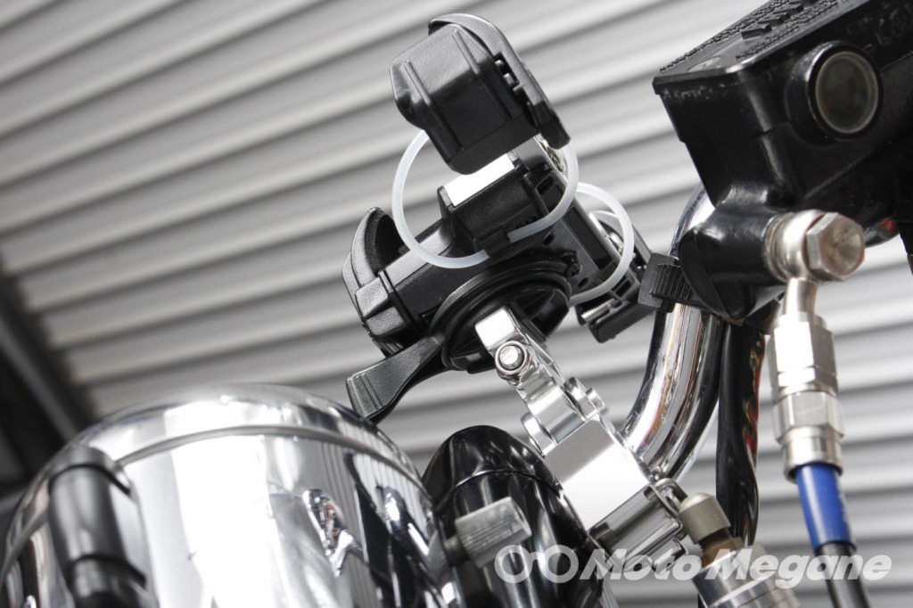VMAXに装着するとハンドルの真っすぐな部分がやや足りない感じ。だが、一応しっかりマウントできている。工具無しで脱着できるので、出先でクランプが緩んだとしてもすぐに付け直すことができる。