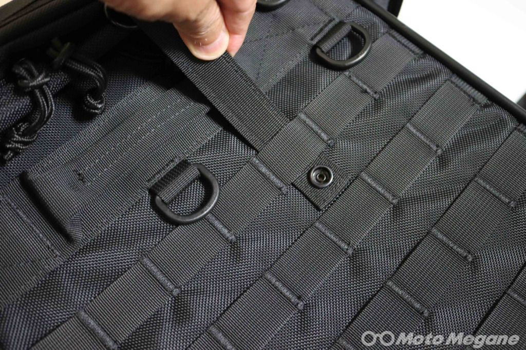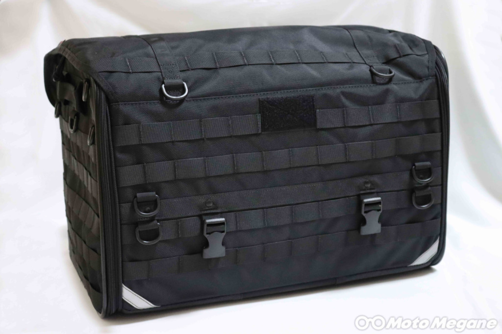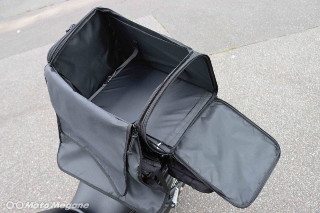 バッグは両サイドが開閉可能なので、荷物の出し入れがしやすい。65ℓもの容量があるのでフルフェイスヘルメットでも余裕で収納することができる。