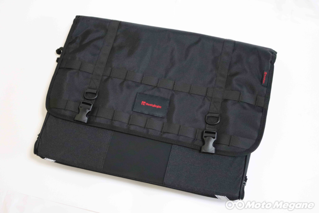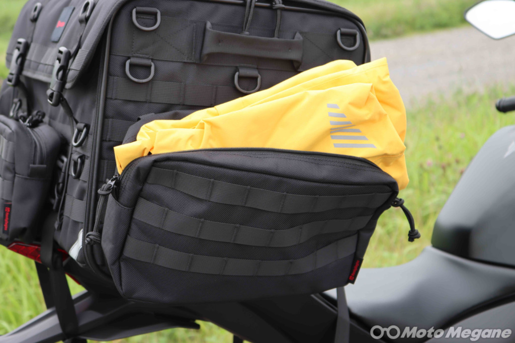 HenlyBeginsシートバッグ最高峰「PRO」シリーズゆずりの高機能が特徴。メインとなるのは容量65ℓのボックス形状をしたソフトバッグ(税込17,600円)。底面・前後面の補強パネルと金属ワイヤーがバッグの剛性を確保するほか、生地には高強度のポリエステルを採用している。●サイズ:H350×W550×D350(mm) ●最大積載重量:14kg