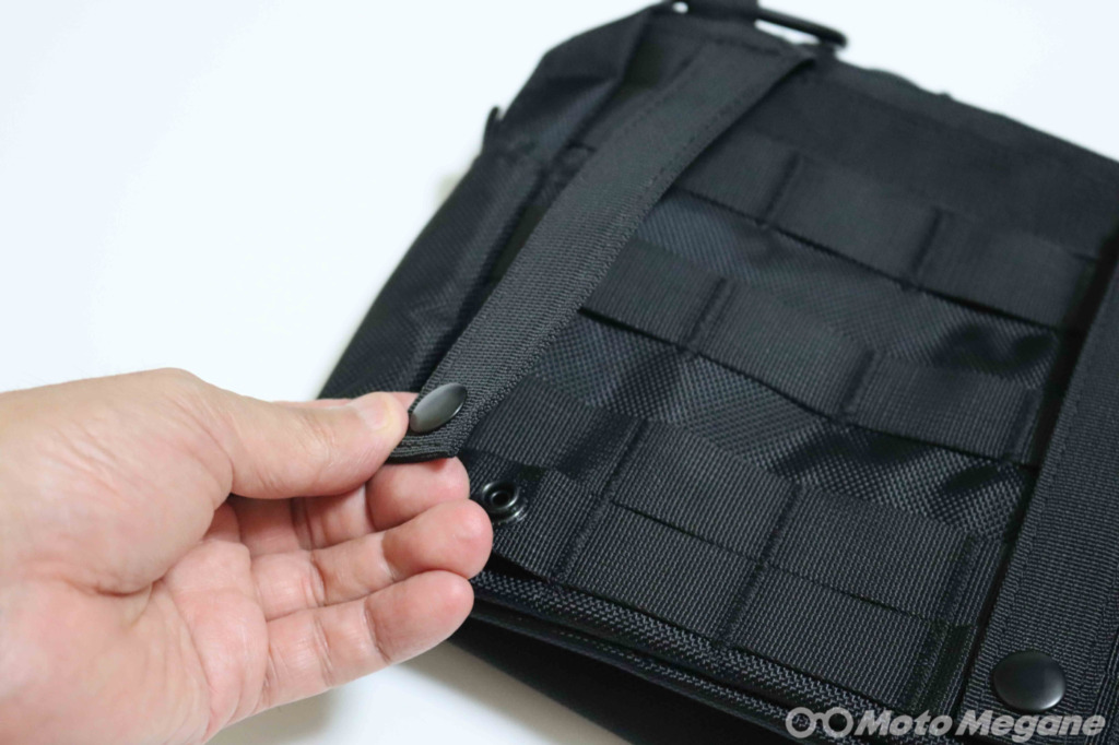 各ポーチにはベルトが装備されており、それをバッグに装備されているPALSテープに通して固定する。自分の好みの位置に好みのポーチを装着することが可能で実に便利だ。