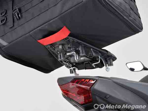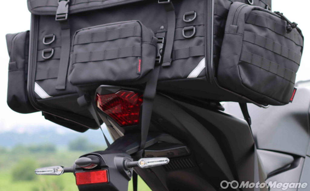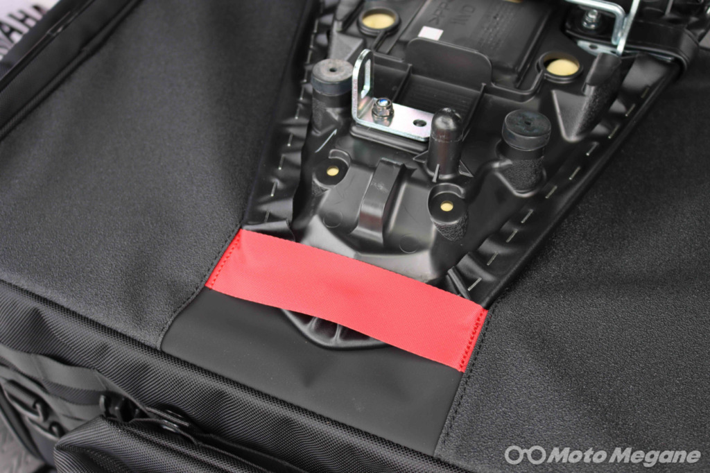 バッグの底辺にあるテープをリヤシート後端に差し込み、付属のベルトで固定すれば一切ぐらつかない。キャンプ用品などをたっぷりと詰め込んでも安心して走れる。