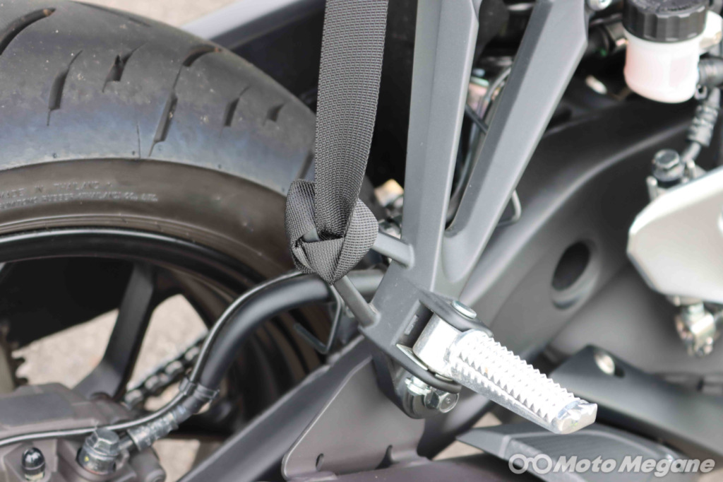 付属のベルトを使用して車体にしっかり固定する。前側はピリオンステップのステーなどに通して固定する。後側はナンバーステーの下側を通して固定する。