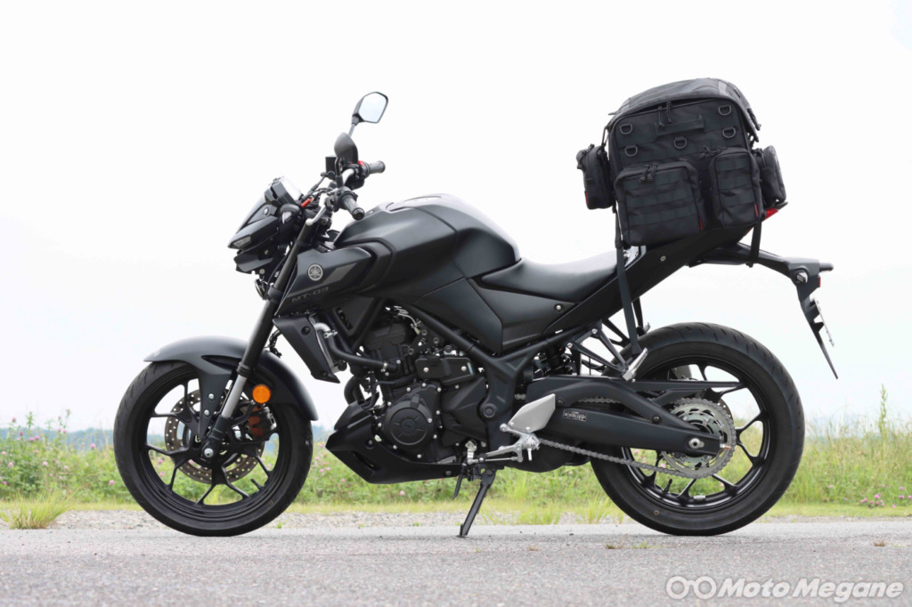 今回取り付けを行ったのはヤマハ MT-03。レーサーレプリカのYZF-03をカウルレスにモデルゆえにリヤシートが小さいため取り付けられるバッグも限られる。しかしHenlyBegins キャンプシートバッグ システムであればMT-03でもバッチリ装着することができた。