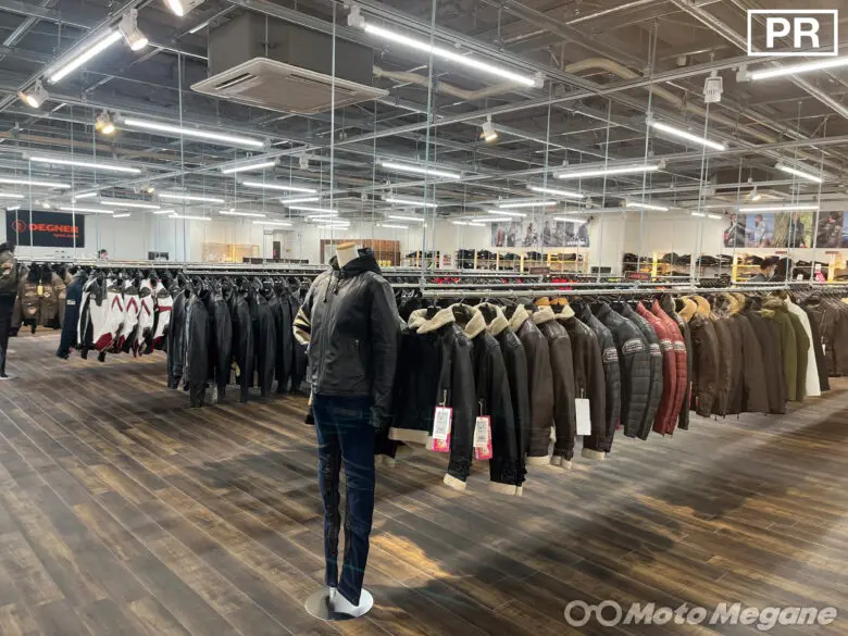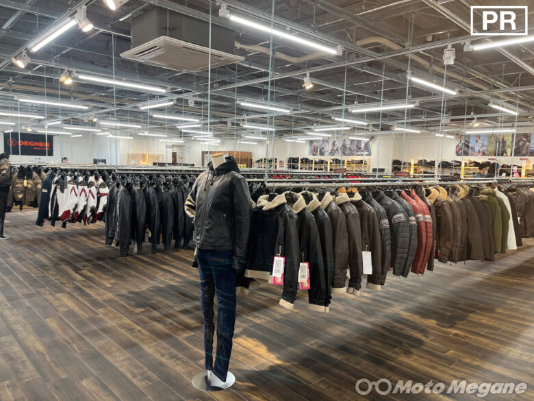 店内には、レザー&テキスタイルジャケットやTシャツ、パーカーなどのウエアに至っては500着〜600着も展示販売されている。一般的な二輪用品店だと販売スペースが限られる関係から、季節に応じて店頭に並ぶ商品が入れ替わる。しかし、この『デグナー八王子店』は季節に関わらず常に全ての商品を手にとってみられるのが大きな魅力! シーズンに先立っていち早くアイテムを入手できるのだ。