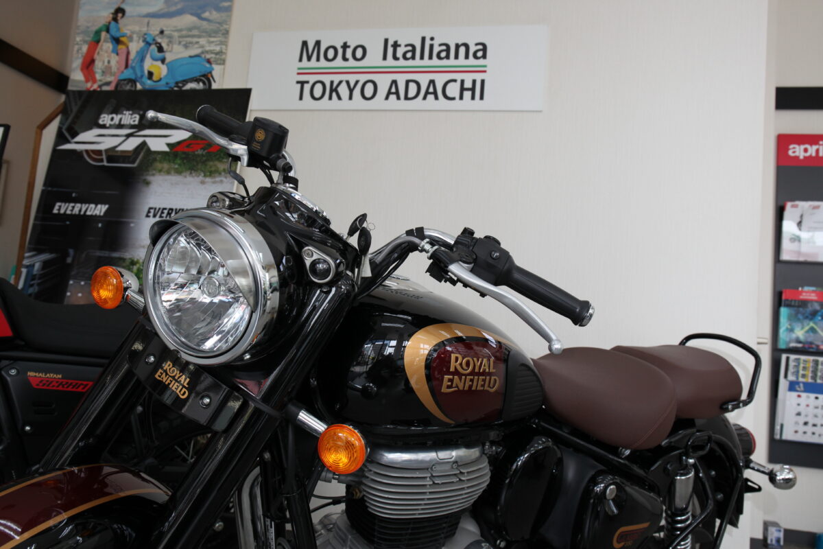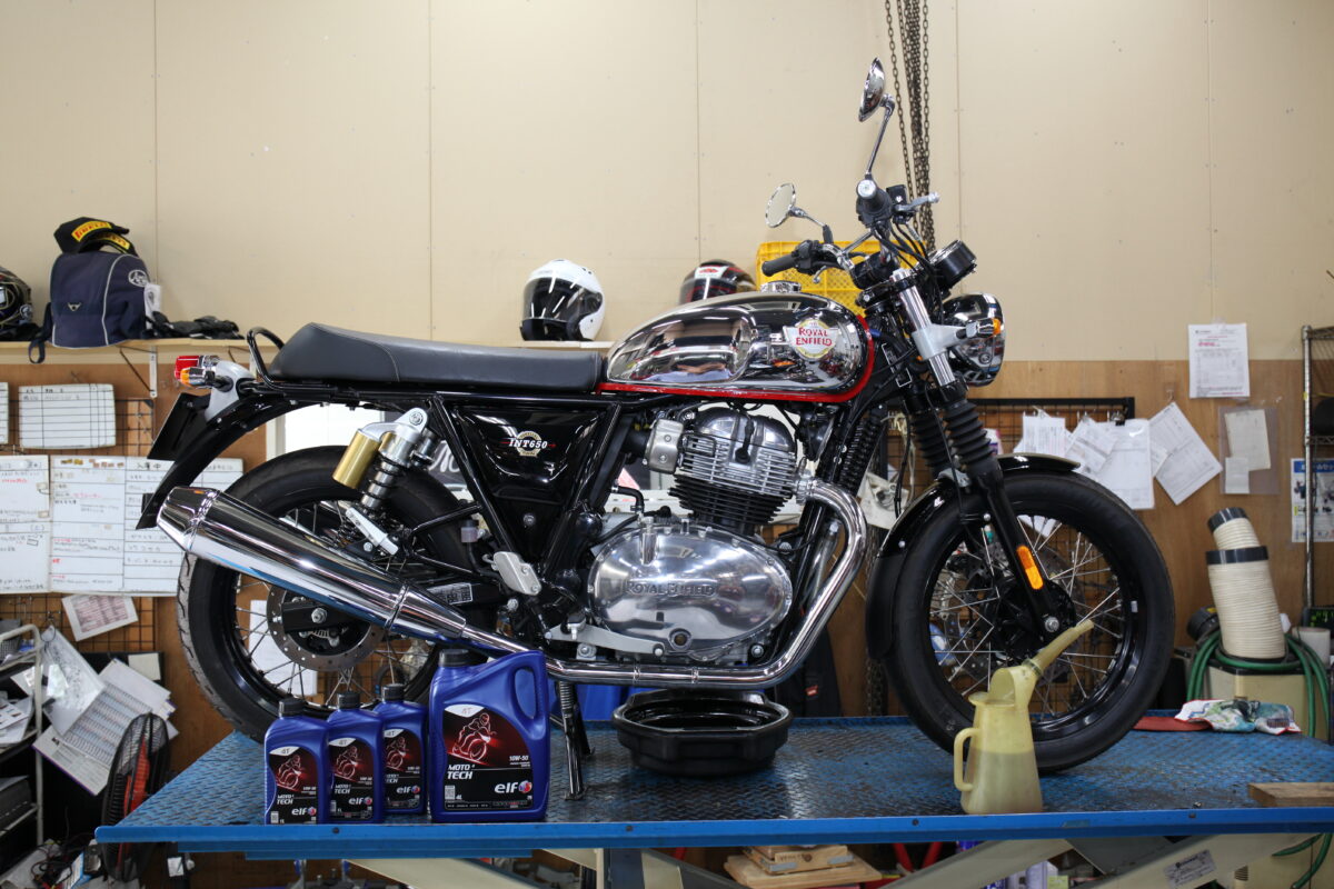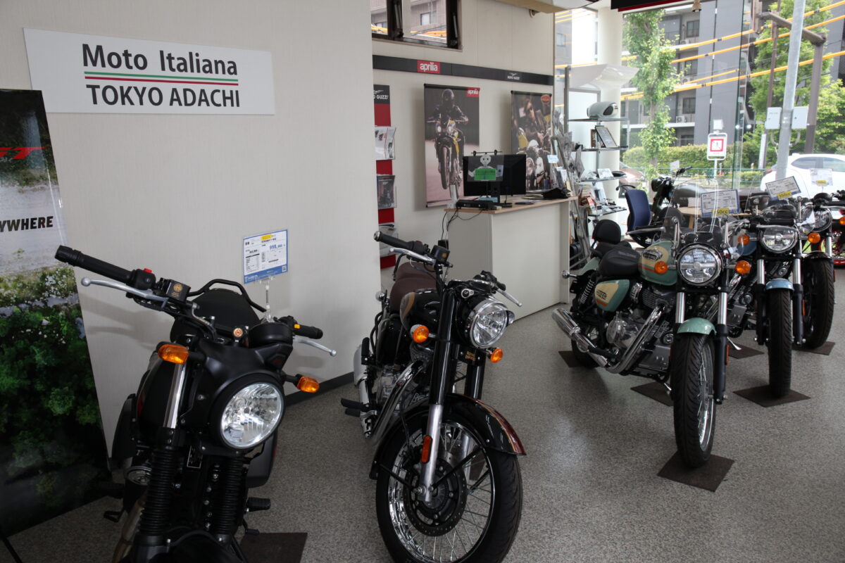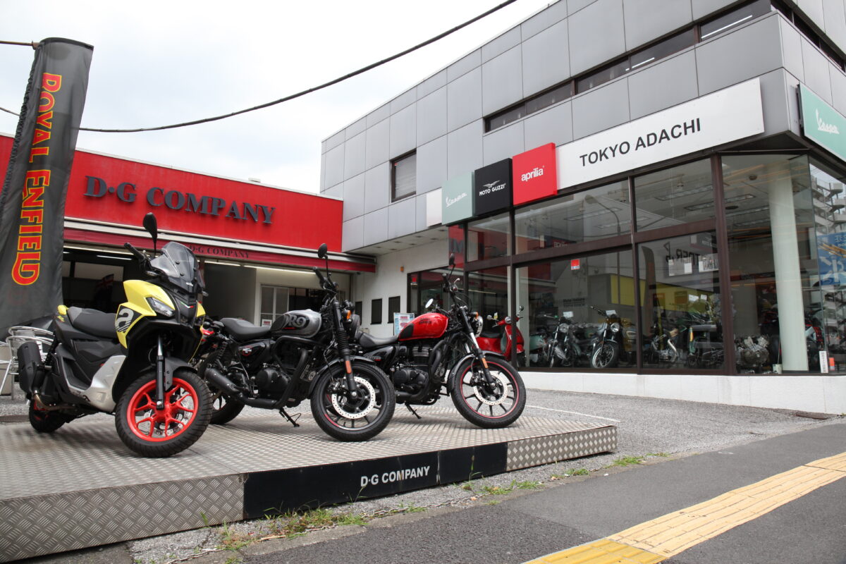 DGカンパニーはモトグッツィ、アプリリア、ベスパ、MUTTモーターサイクル、ロイヤルエンフィールド、キムコなど海外メーカーの車両を数多く取り扱っているお店だ。中でもロイヤルエンフィールドはELFオイルと強固なつながりを持っている。
