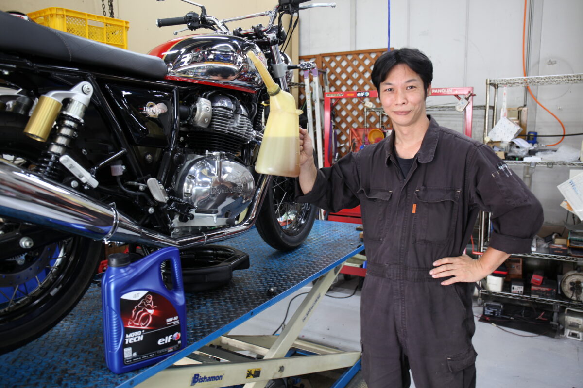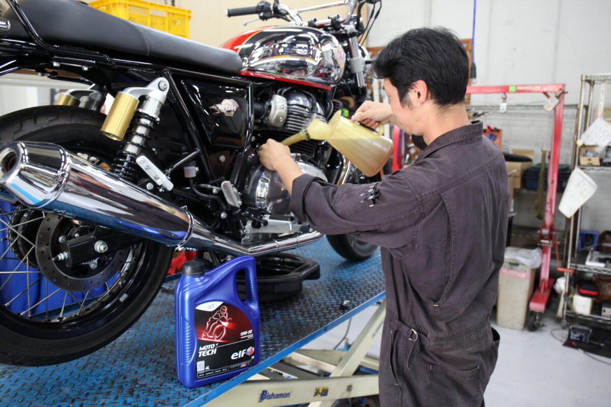 以前は他メーカーのオイルを扱っていた藤井さんだが、プライベートで楽しんでいたバイクライフにおいて「ちょっと不満を感じたんですよね。そこでいくつかのオイルを使わせてもらった上でelfさんに決めました」という。その中でポイントとなったのはコストパフォーマンスの高さだ。「お客さんのことを考えた時に、高額になり過ぎてはキツいのです。熱に対する耐久性にもこだわりつつ、納得できるパフォーマンスをなるべく手頃な価格でと考えました」と言う。プロが認めるコストパフォーマンスを備えているのがMOTO 4 TECH 10W-50の長所だ。