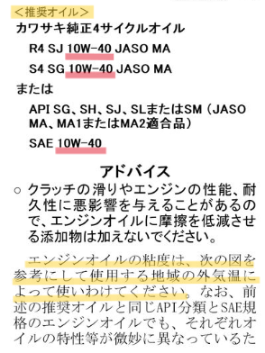 カワサキに至っては、状況に合わせて推奨粘度以外のオイルを使い分けるようマニュアルに明記している。※下図の黄線・赤線参照