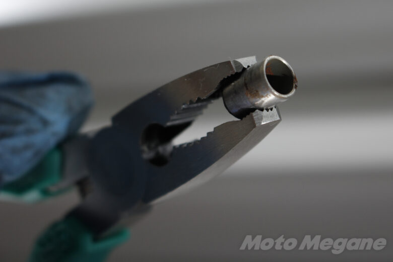 で、抜く方が良いのですが、薄肉の円筒形状なのでプライヤーなどで掴むと潰れて変形し、さらに抜けなくなってしまうのです!
