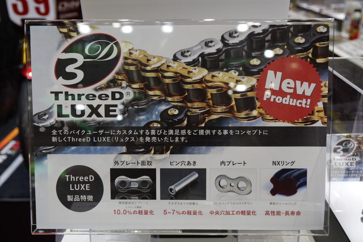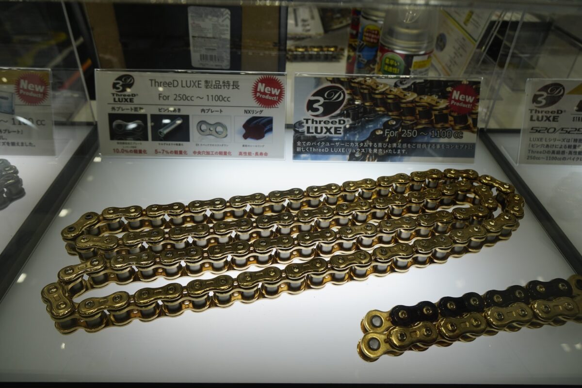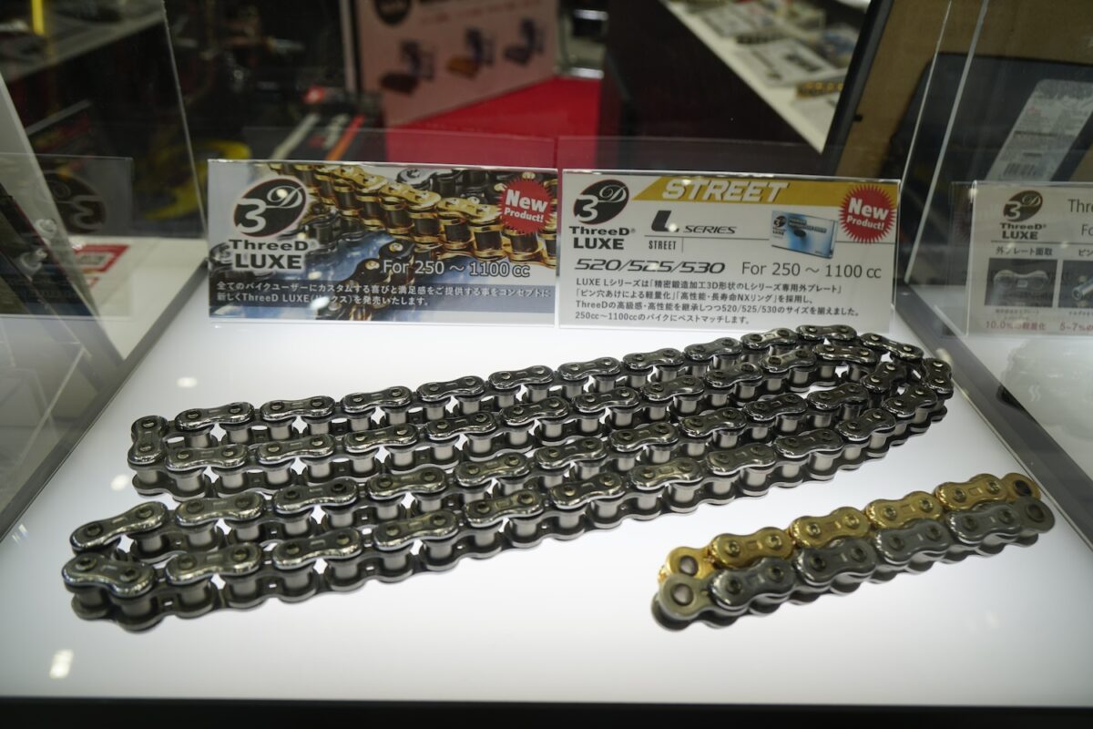 その江沼チヱン製作所のバイク用ドライブチェーンは、サイズ・グレード・カラーが豊富な『EK』と、次世代型チェーンとして開発された『ThreeD(スリード)』の2つのブランドが並び立つ。とくにThreeDはクオリティと性能面だけでなく機能美も高く評価され、発売以来カスタムパーツとしても人気を得ている。