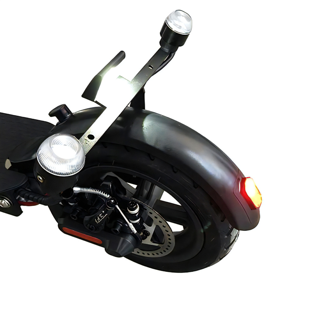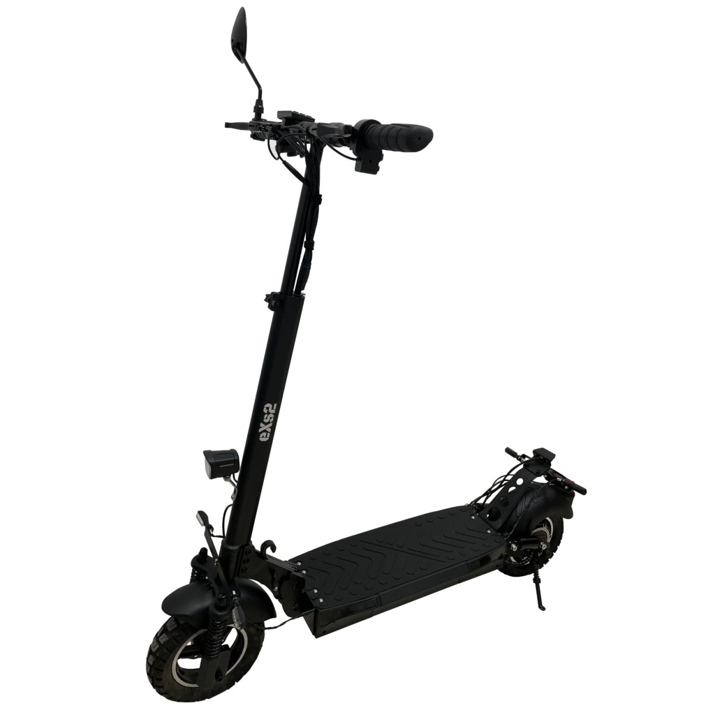 【新型eXs2:SPEC】サイズ:展開時/長さ1190㎜×幅800㎜(ハンドル幅)×高さ1425㎜(ミラー含む)、折り畳み時/長さ1190㎜×幅800㎜(ハンドル幅)×高さ457㎜、タイヤサイズ:10インチ、充電所要時間:約5~7時間、走行可能距離:40~45km、モーター定格出力:500W、搭載バッテリー:48V12.5AH、重量:23.5kg、最大荷重:120kg、走行モード:3段階切り替え、登坂能力:最大勾配20度、ブレーキ:前輪(ディスクブレーキ)/後輪(ディスクブレーキ)