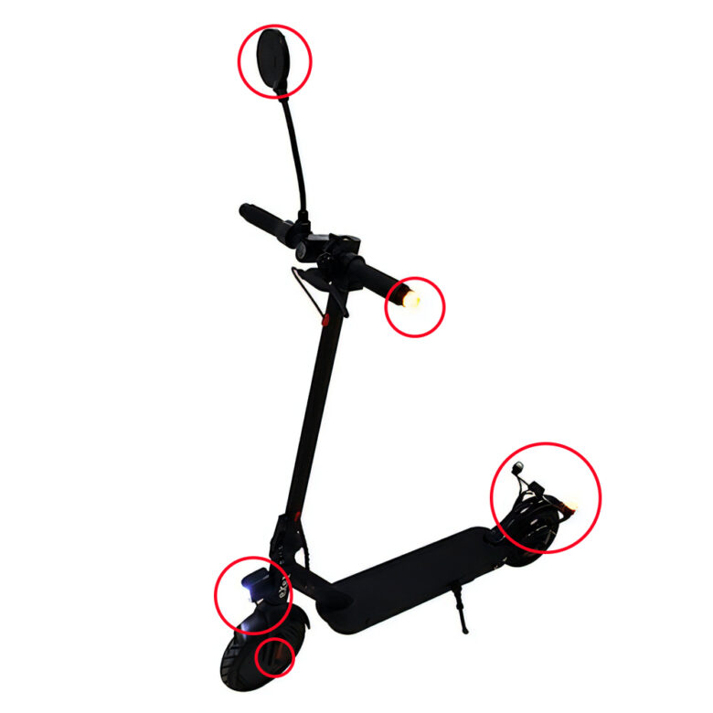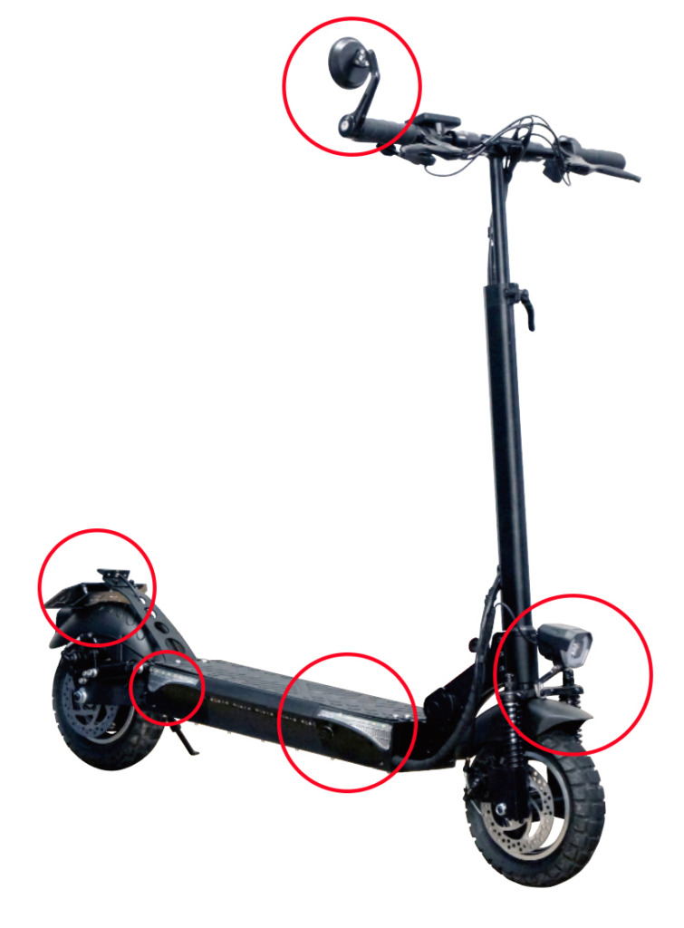 まずはスタンダードモデルのeXs1の新旧を比較チェック。赤丸で囲った部分が主な変更点だ。旧型ではヘッドライトの位置がタイヤのすぐ上にあったが、新型では高い位置に変更されている。もちろんLEDだ。そしてウインカーは旧型ではフロント用はハンドルの先端に取り付けられていたが、転倒時に割れやすいという声があり、新型ではフロントタイヤの上に変更されている。リヤウインカーについてはLEDタイプを継承、ナンバーステーは旧型では片側のみだったが、新型は両側になり剛性を増している。また、フロントにディスクブレーキが装備されたのは大きな進化だ。より確実に止まることが可能になり、安全性能が向上している。タイヤがチューブタイプからパンクレスへと変更されているのも嬉しいポイントだ。そしてバックミラーのサイズが大きくなっているのも変更点の1つだ。