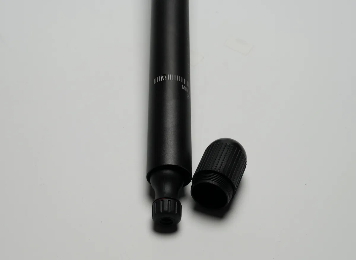 ちなみに場所は一見何の変哲もないシートポストで…シートポストをスポッと抜いてから〜の、先っちょの蓋を開けてから〜の、中から空気入れがこんにちわぁ♪っと出てくるので…あとはそのままタイヤに空気を注入できる実に画期的な仕様となっております!