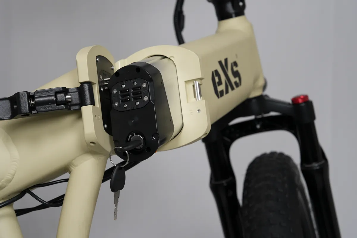 しかもバッテリーがフレームに内蔵されているので、eXs Streetのスタイリッシュなフォルムを崩すことがなく…なんなら取り外しもできるので、バッテリーを室内に持ち込んでの充電も可能です。